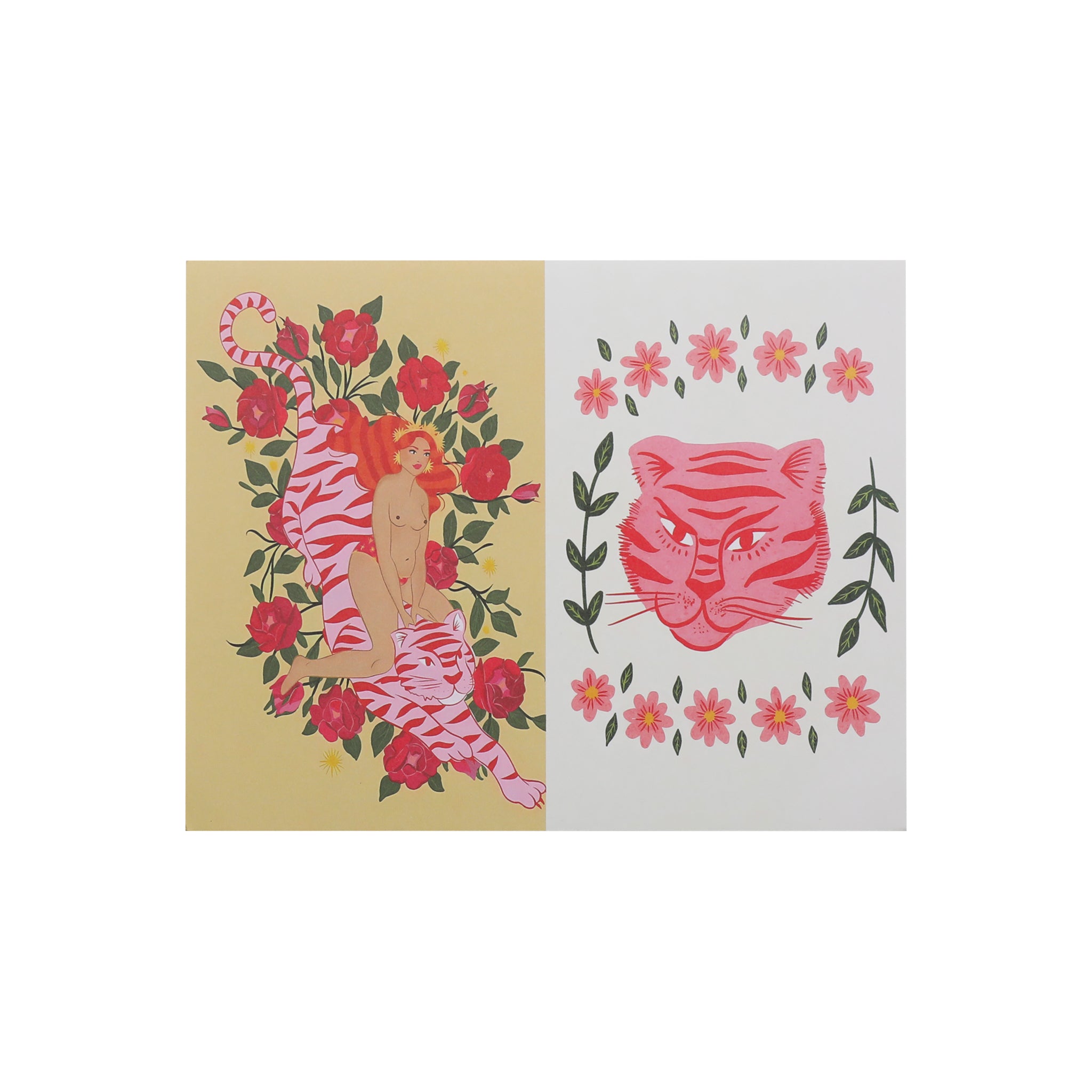 The dominant colors of pink, red, green, and yellow, with accents of white, black, and gold, create a vibrant and eye – catching palette. The intricate designs feature a rich array of patterns and motifs. You’ll find sacred hearts with flames, some adorned with red roses, eyes, arrows, and tears. There are also felines like pink tigers, black panthers with floral patterns, and a white cat with a red bow. Mythical and nature elements such as mermaids, nude figures with flower crowns, a woman holding a heart – shaped vase, and a woman riding a red horse add a touch of magic. Floral details, including roses, daisies, and stylized flowers, are used as central motifs or border elements.