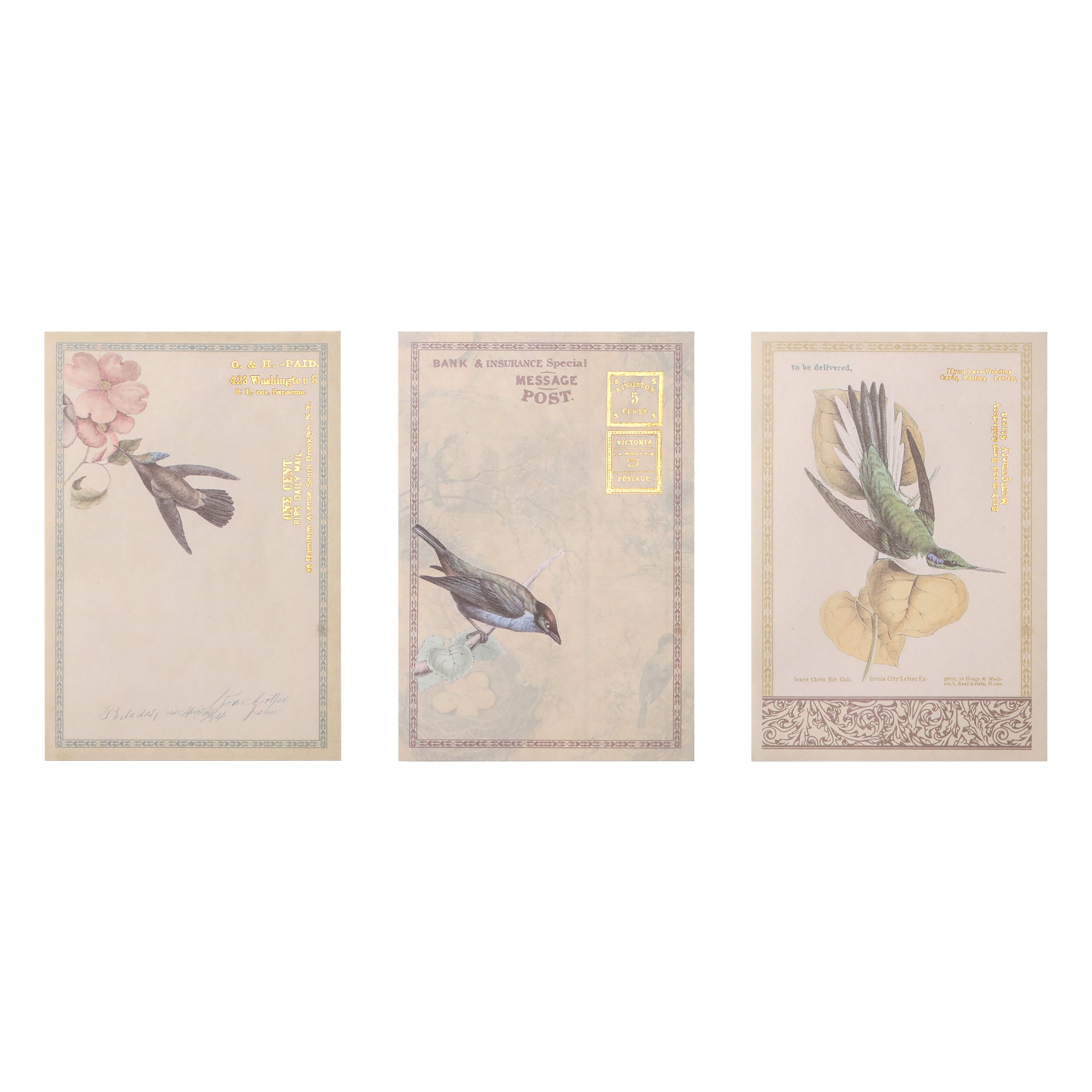 | Visual Elements | Ornate bird and floral illustrations with gold detailing, bilingual text (English and Chinese), stamp – like gold text |