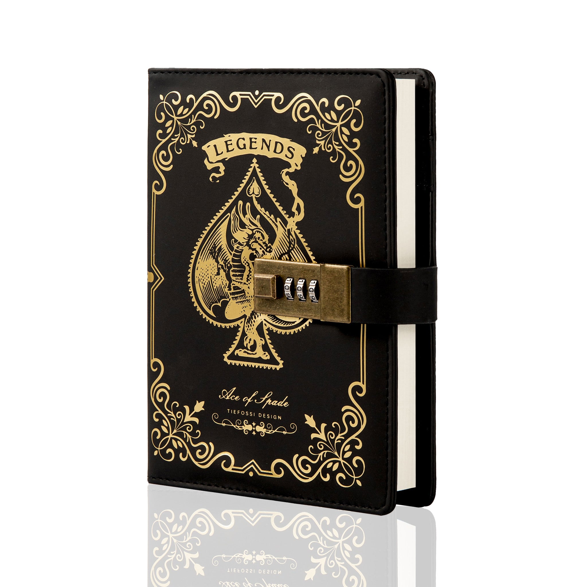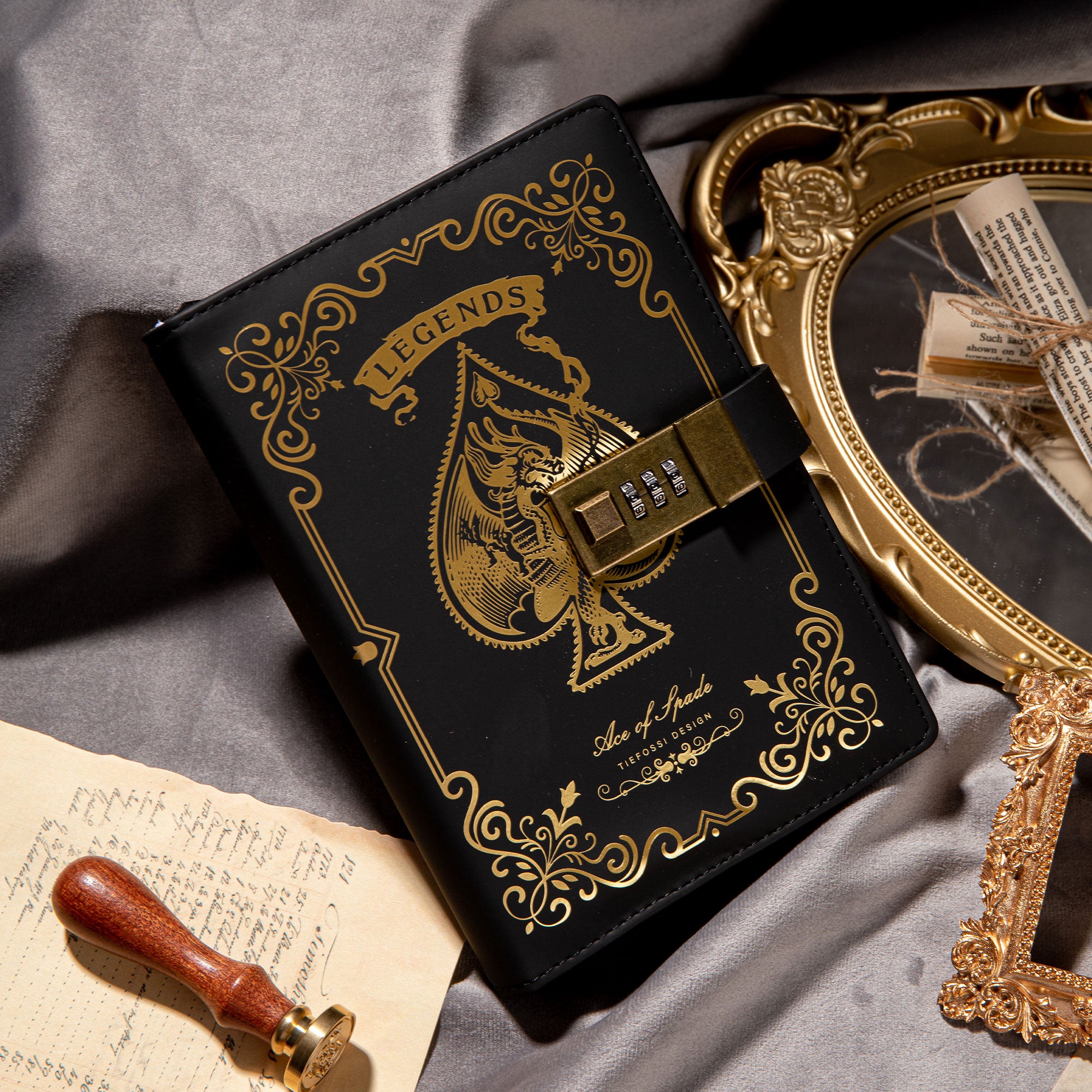 - Ornamentation: Embossed/gilded details including a “LEGENDS” banner, spade graphic with a mythical beast, and decorative scrollwork