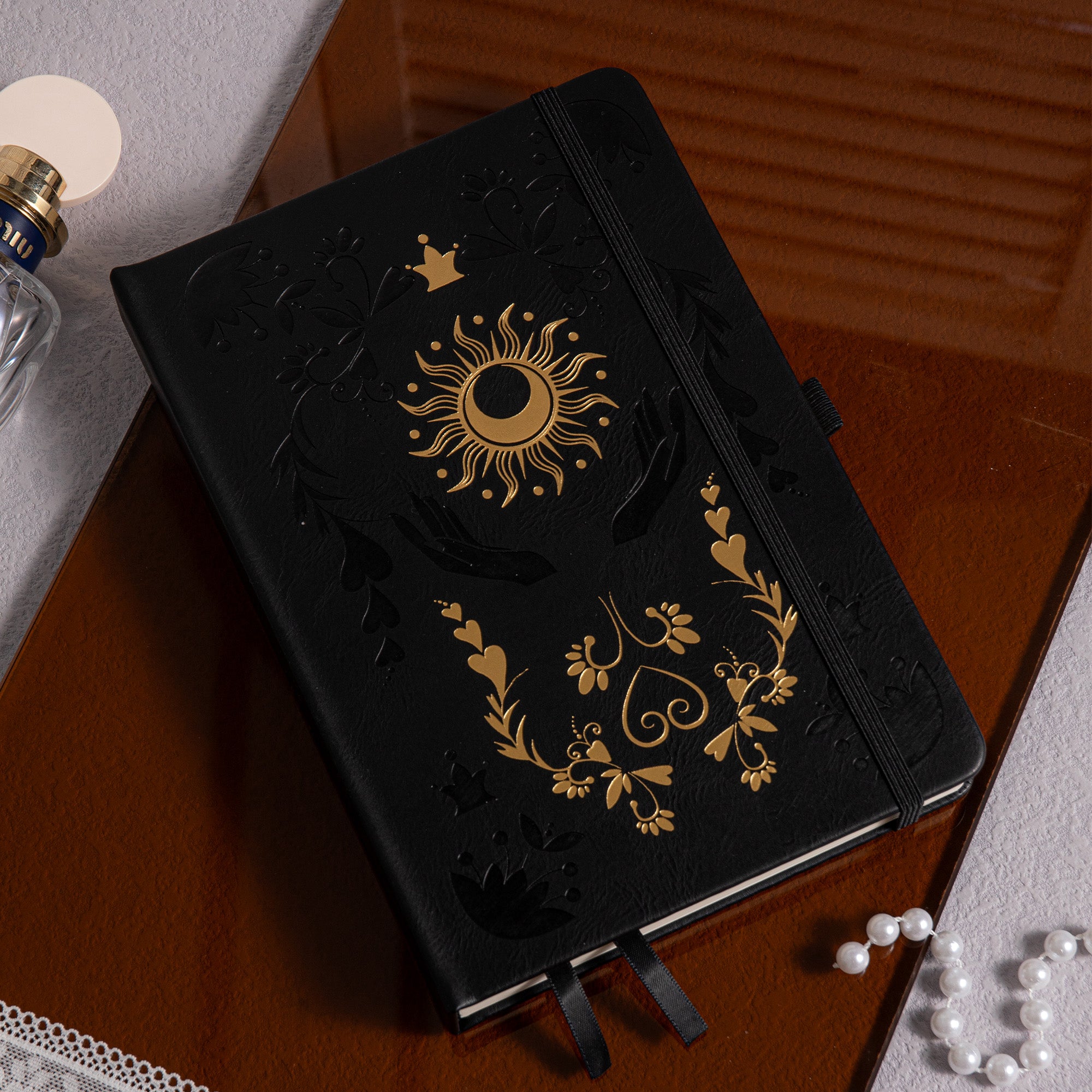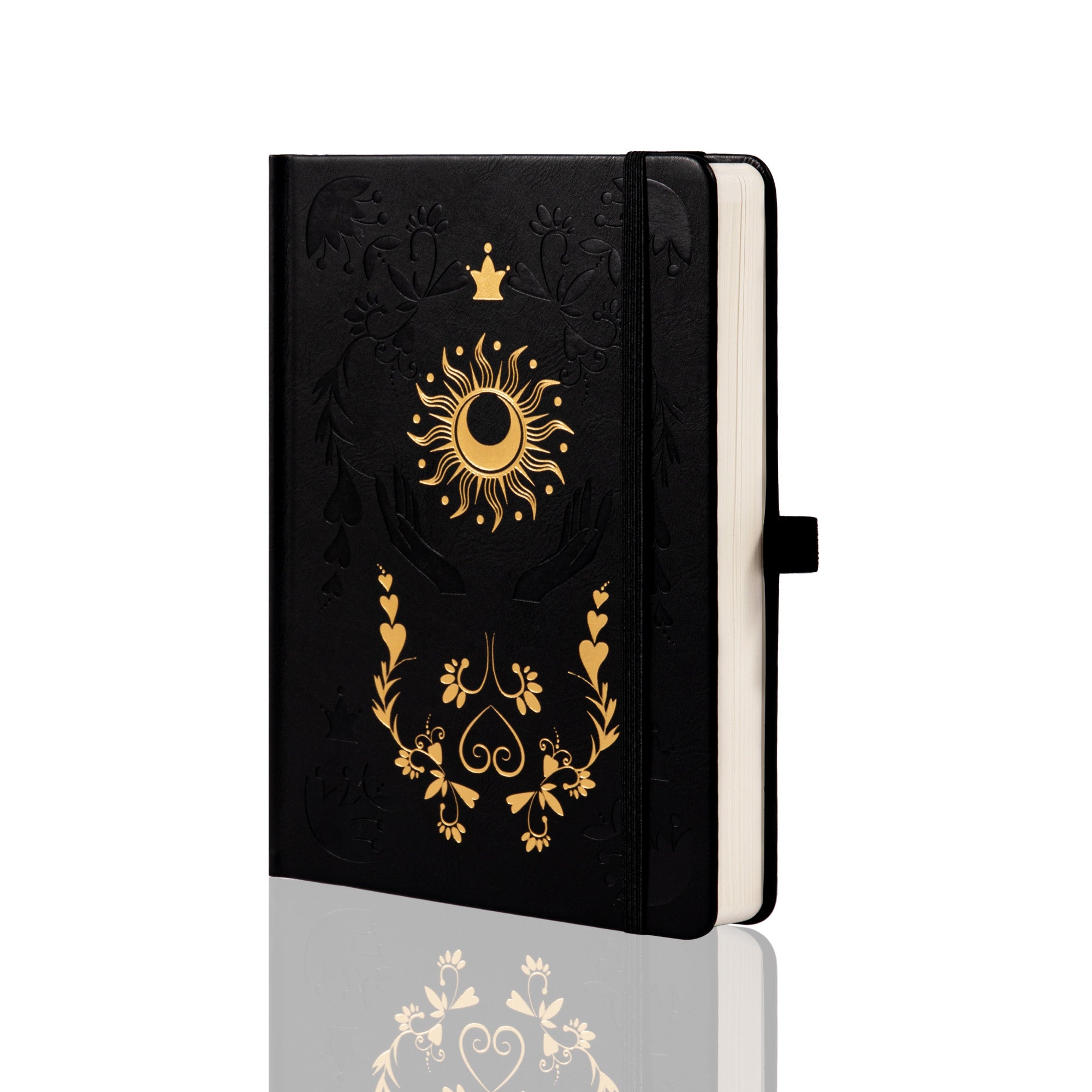 | Cover Design | Debossed and gold – stamped with hands holding the sun and moon |