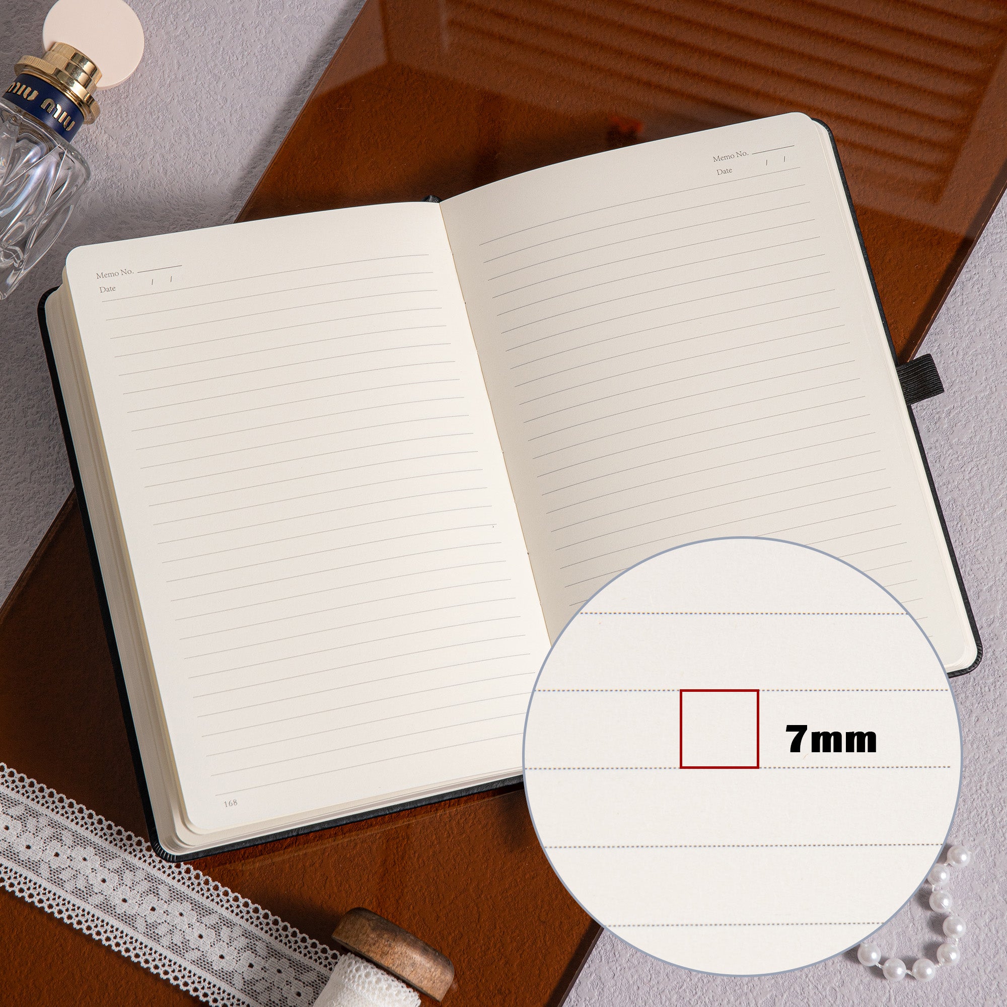 - Number of Pages: 318 numbered pages with 7mm distance light grey ruled