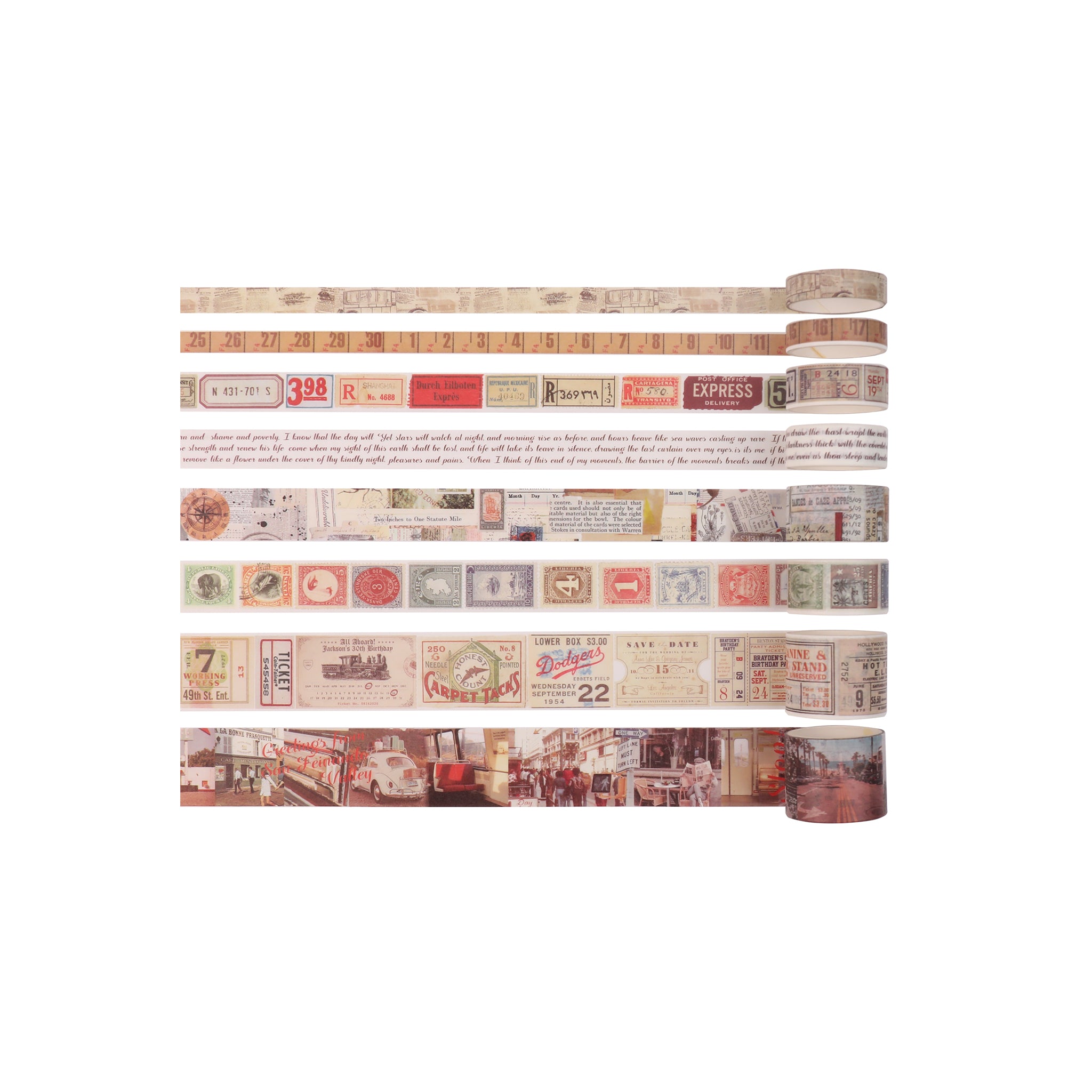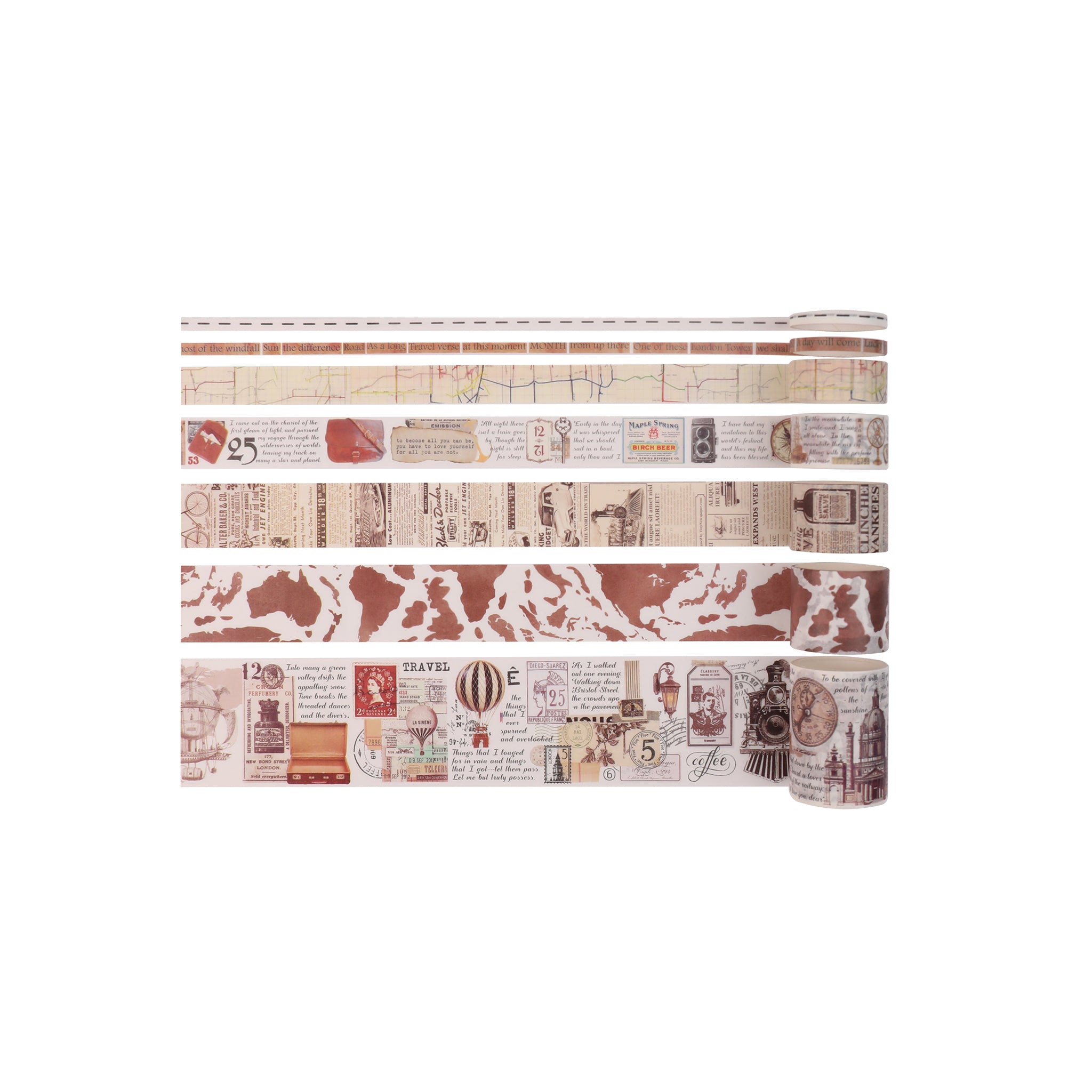 The color palette of these tapes is a blend of muted, vintage tones including earthy browns, beiges, cream, and subtle red/orange accents. The designs are unified by a “vintage travel/ephemera” theme and feature various elements such as old – world maps, newspaper clippings, handwritten text snippets, vintage stamps, train tickets, currency – like designs, bicycles, coffee cans, old automobiles, and steamships. Some rolls also have aged, worn patterns to mimic antique paper and dashed edges for easy tearing.