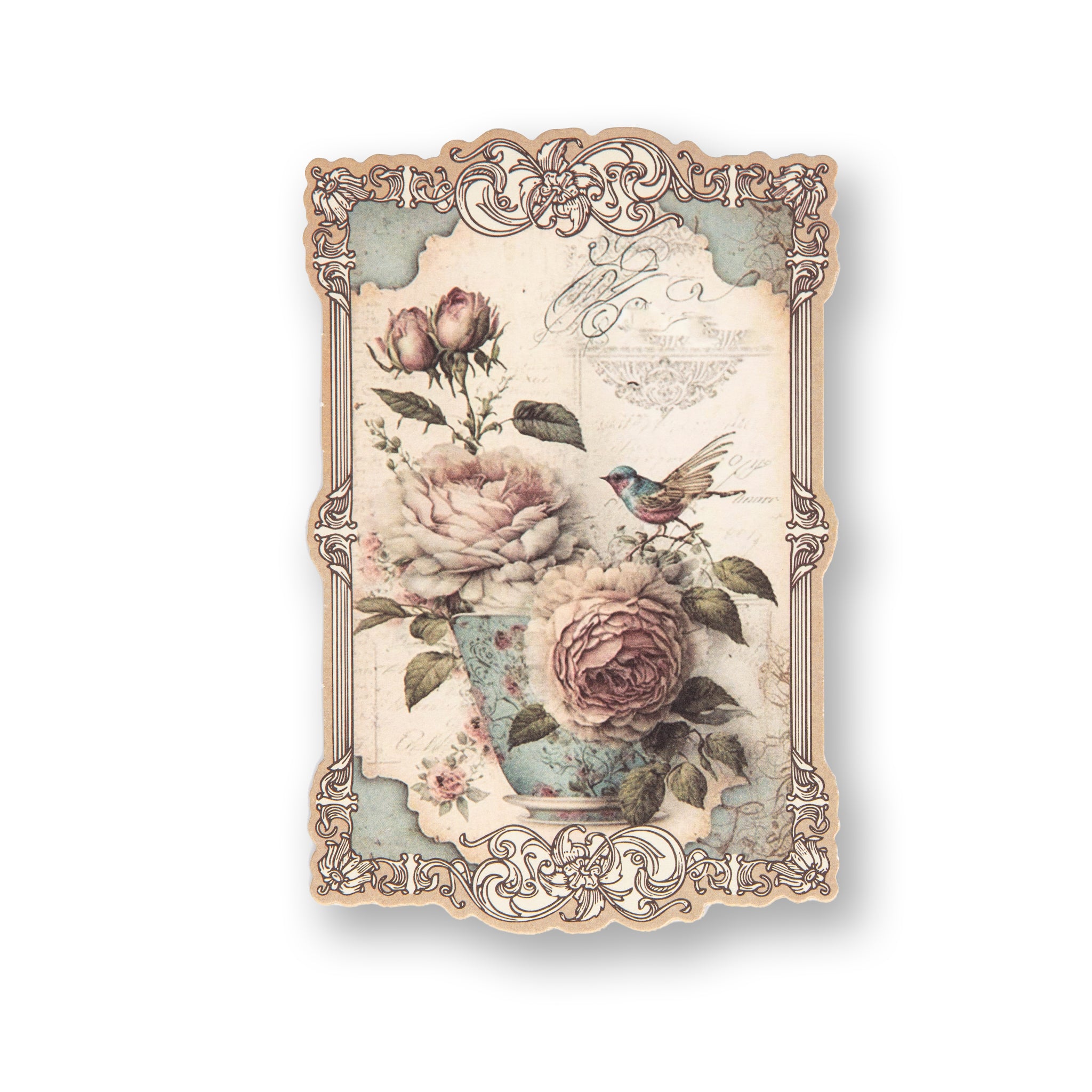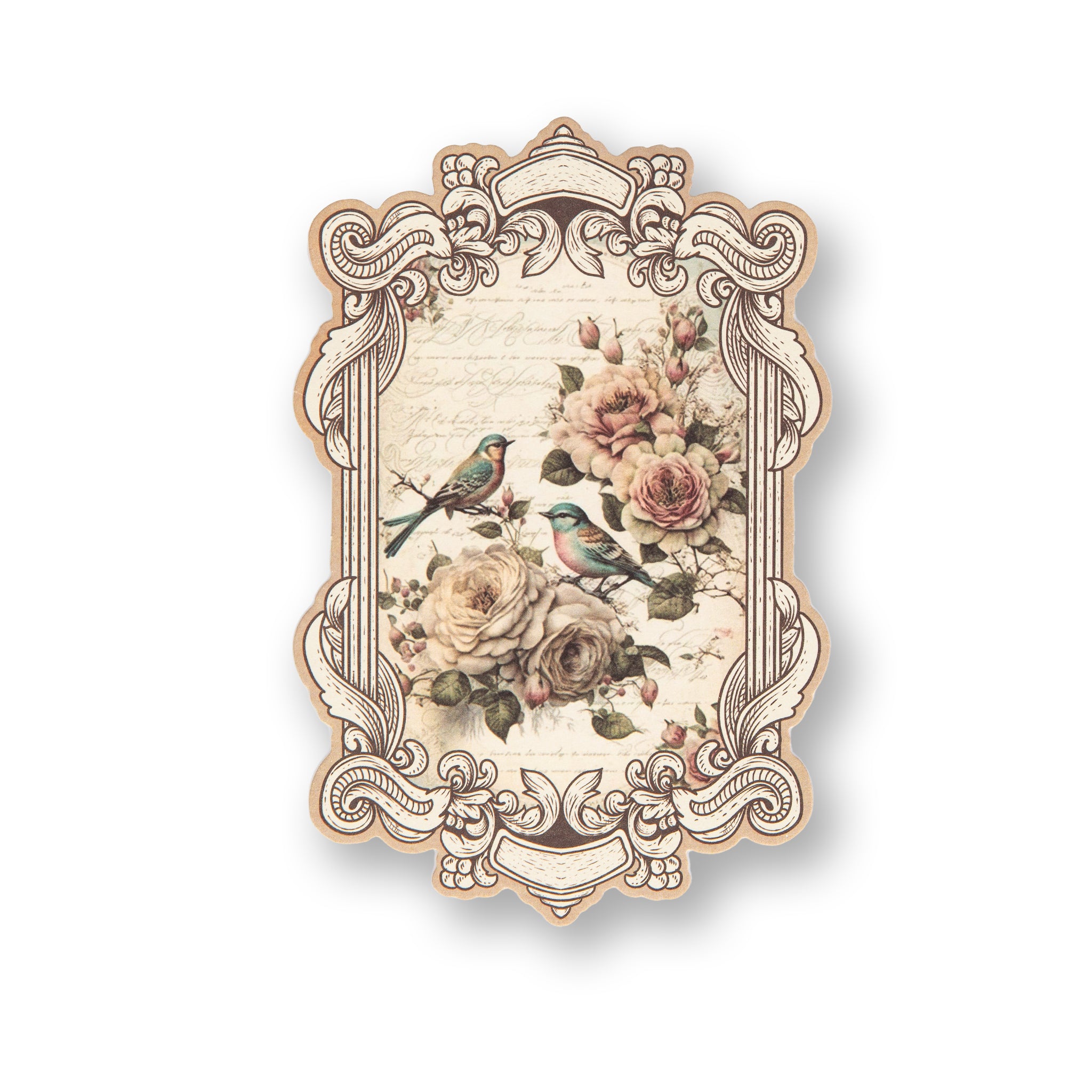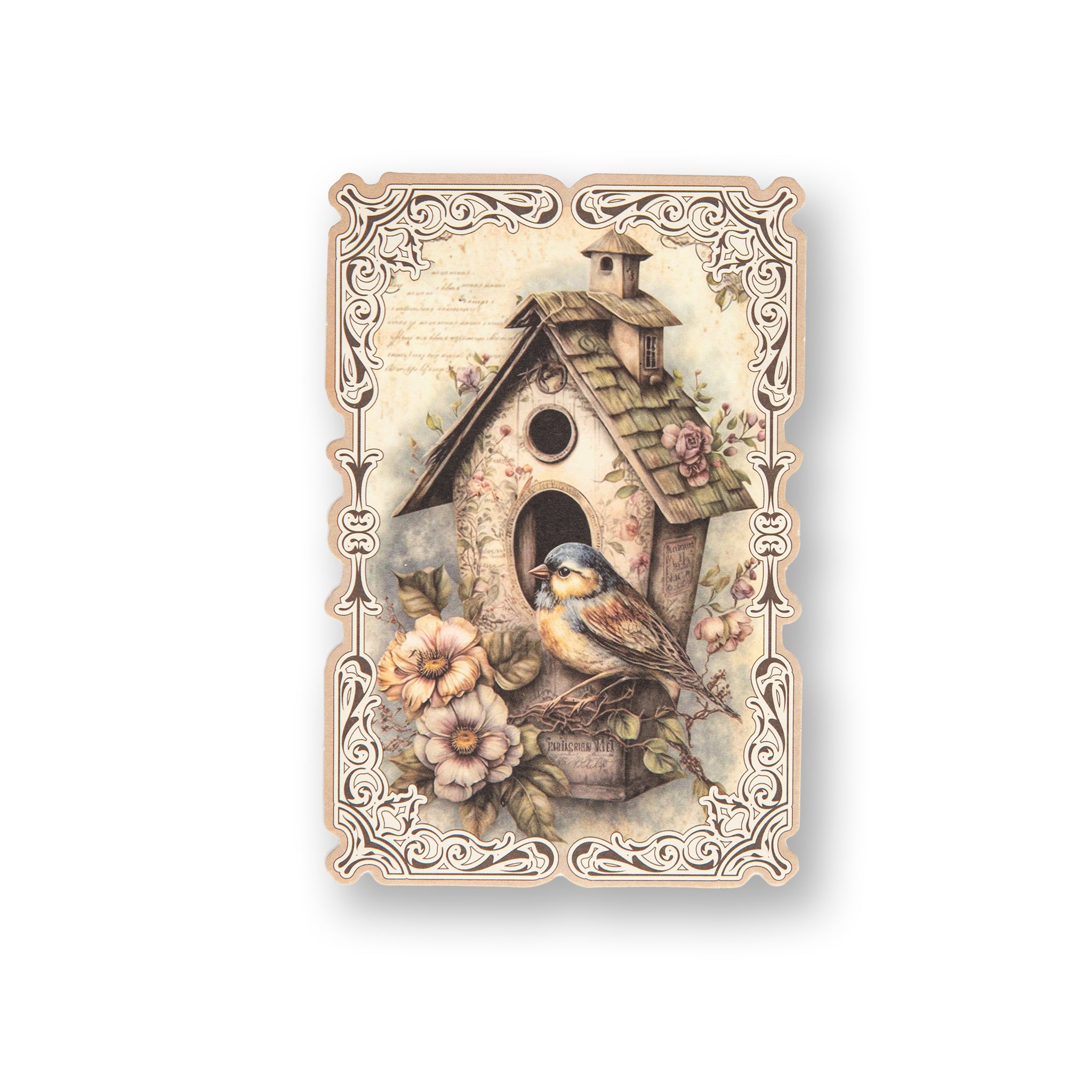 - Designs: Features beautiful motifs like roses, birds, and birdhouses set against faded script backgrounds