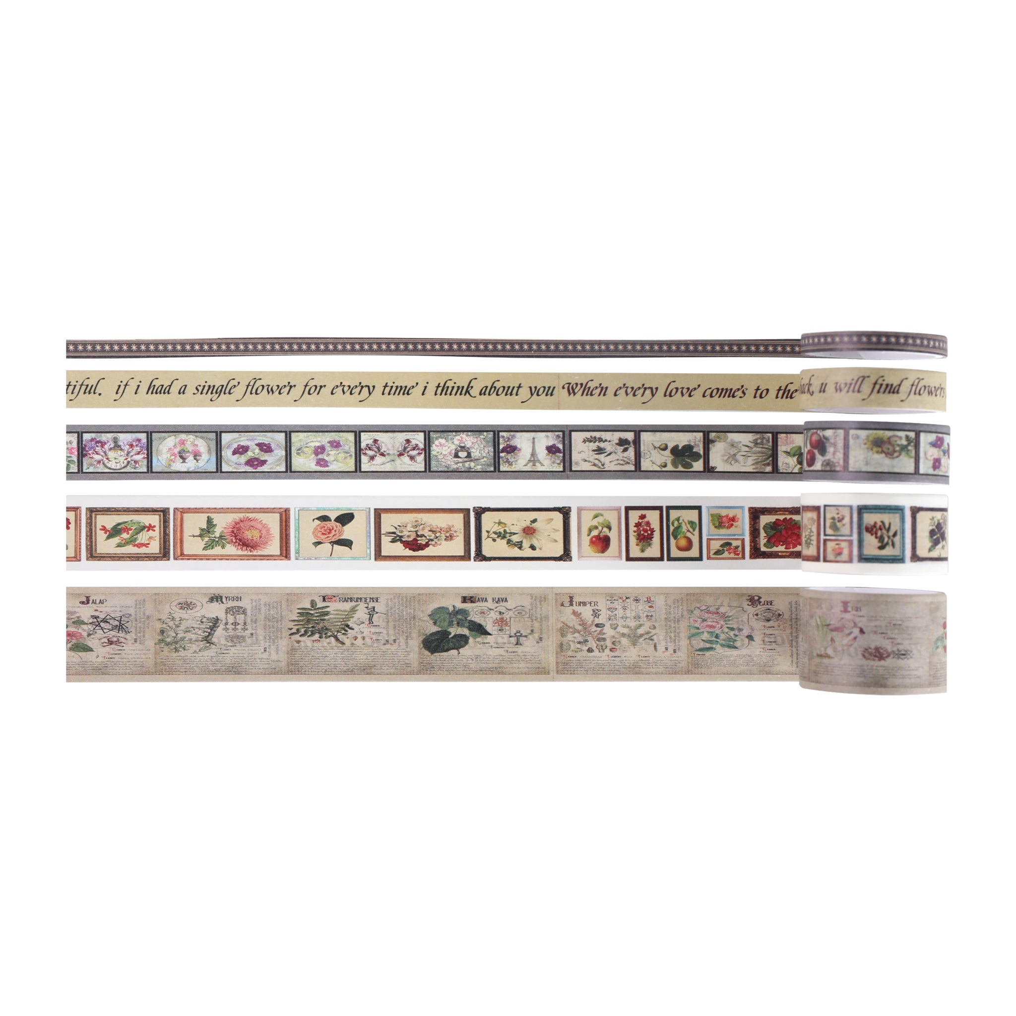 The color palette of these tapes is dominated by shades of green such as mint, sage, olive, and forest green, complemented by white, beige, and brown accents. There are also hints of blue, red, or black for text elements. The patterns are a wonderful blend of nature and creativity. You’ll find botanical themes like ferns, leaves, tropical foliage, and floral illustrations, along with vintage botanical sketches. Inspirational phrases and organic labels add a unique touch, and textured details like calendar grids, brick wall patterns, checkered/gingham, polka dots, and newspaper – like print strips make each tape roll special. The vintage/vignette styles with aged paper textures and antique – style borders give an old – world charm.