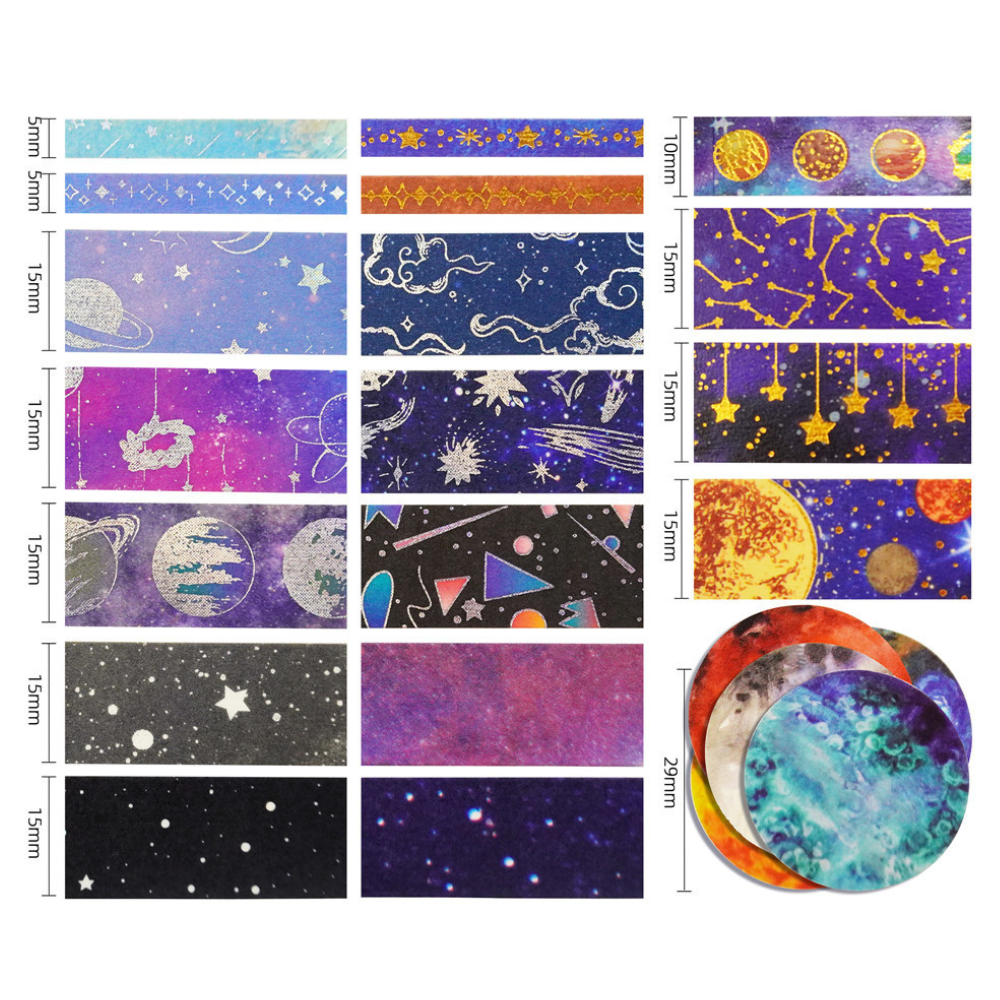 - Designs: Constellations, planets, moon phases, galaxy textures, comets, rockets, star clusters, and celestial symbols