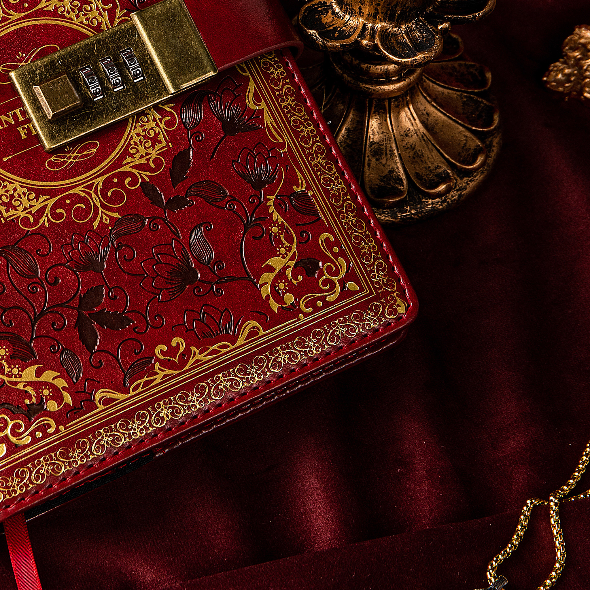 | Closure Mechanism | Simple: Red leather strap with a gold buckle/snap; Ornate: Combination lock attached to a red leather strap |