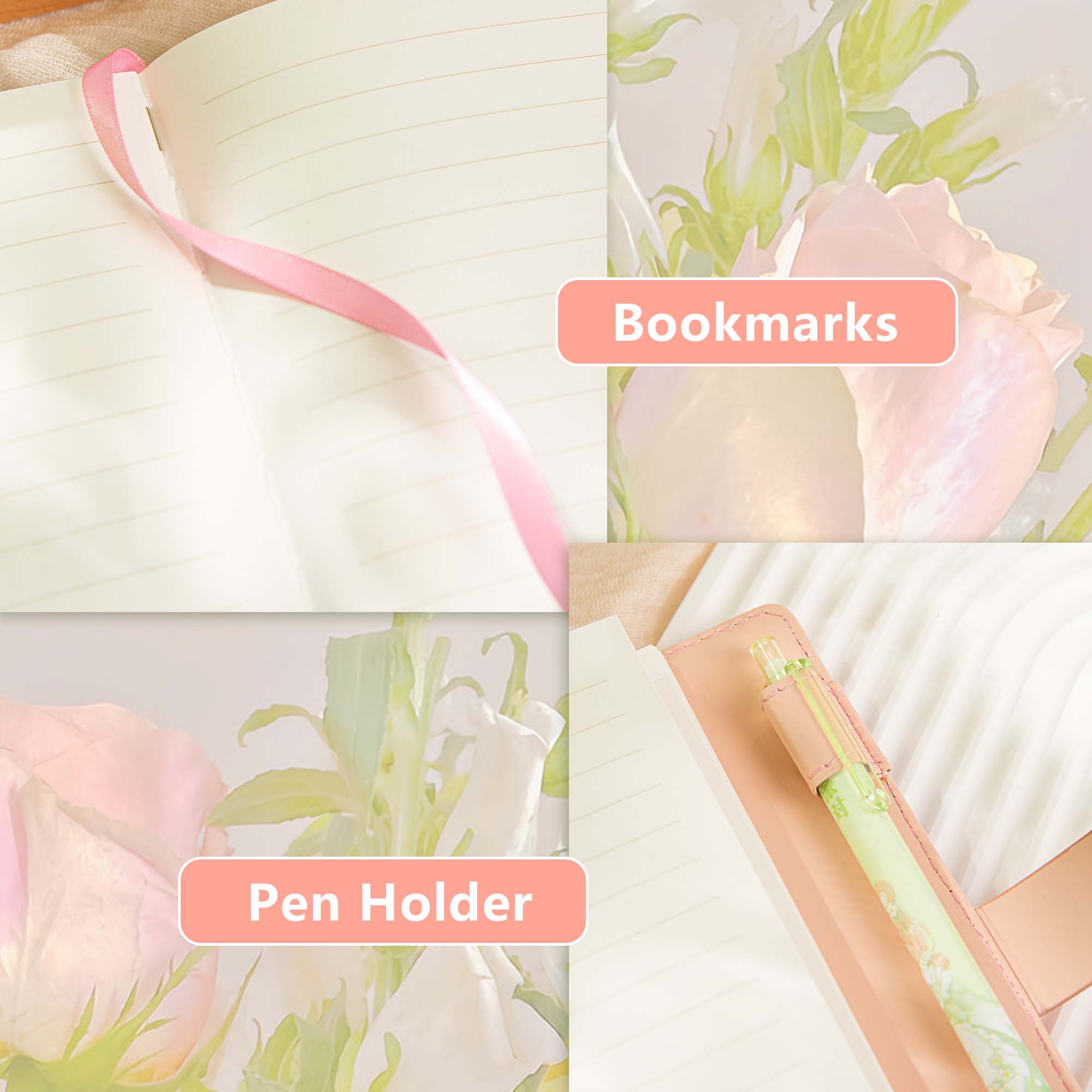 - Strap & Buckle: A light pink strap with a metallic buckle secures the journal closed.