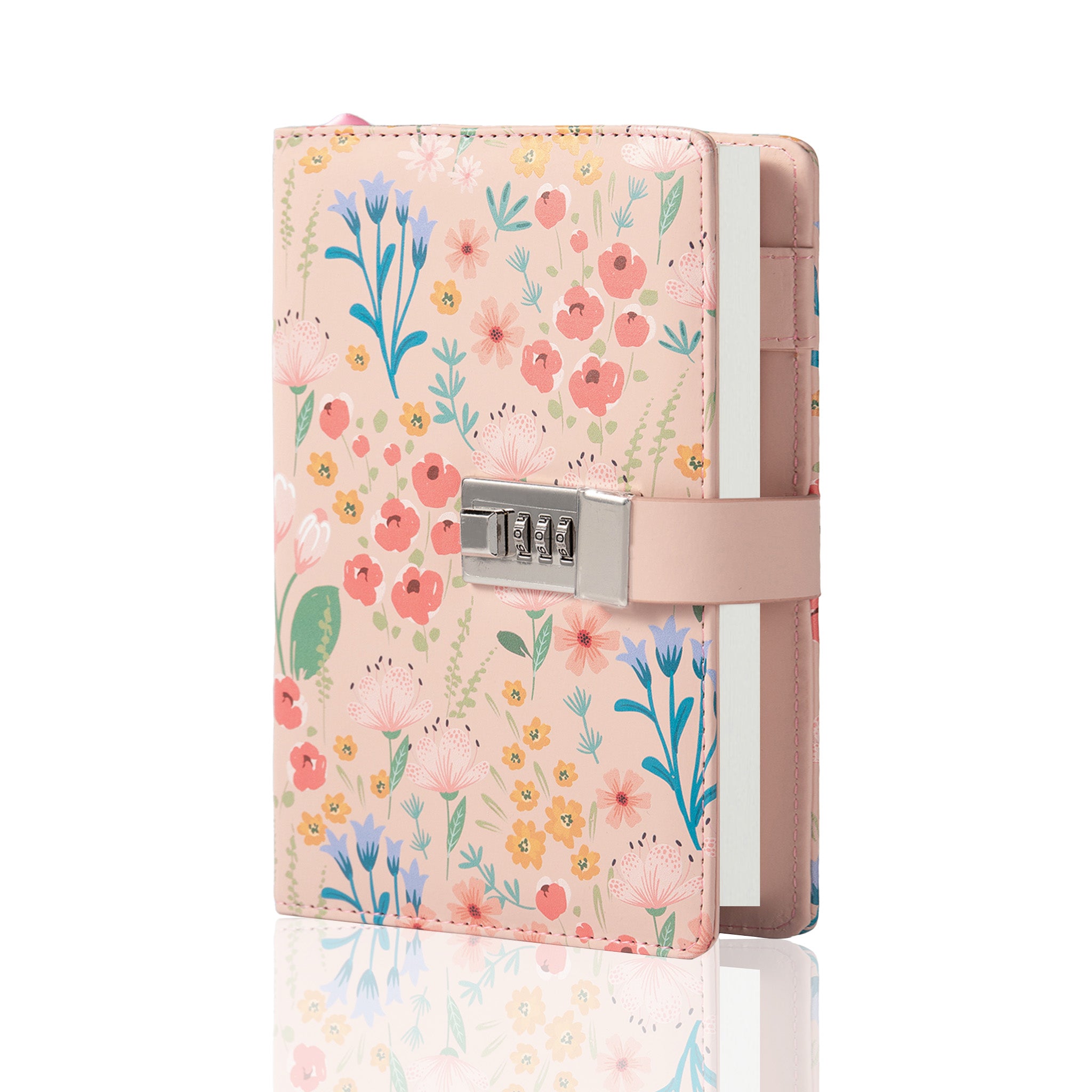 | Color | Soft, light pink/peach base with red/pink, blue, yellow, green, and white floral prints; silver (lock), light pink (strap/buckle), white (internal pages) |