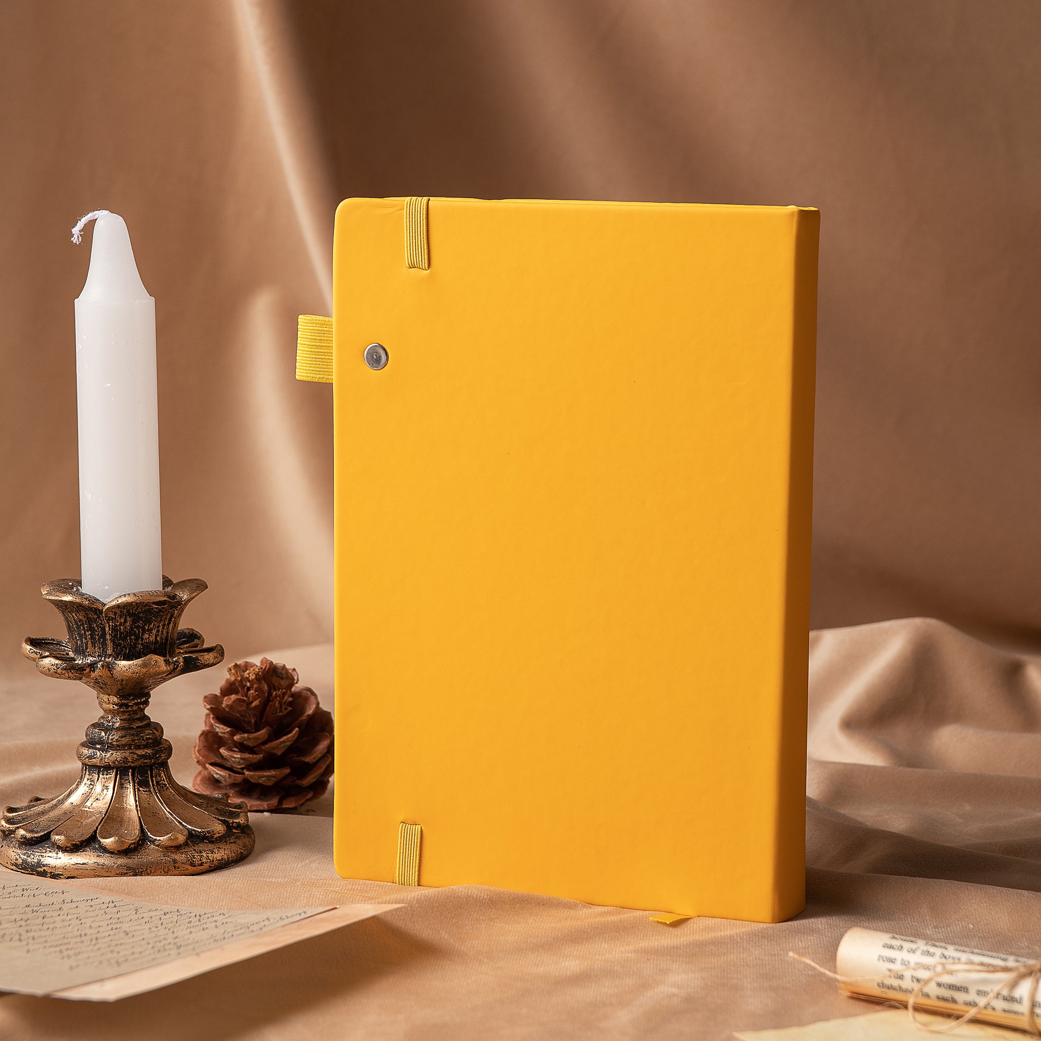 - Closure: Secure yellow elastic strap and a metal snap/button on the back cover