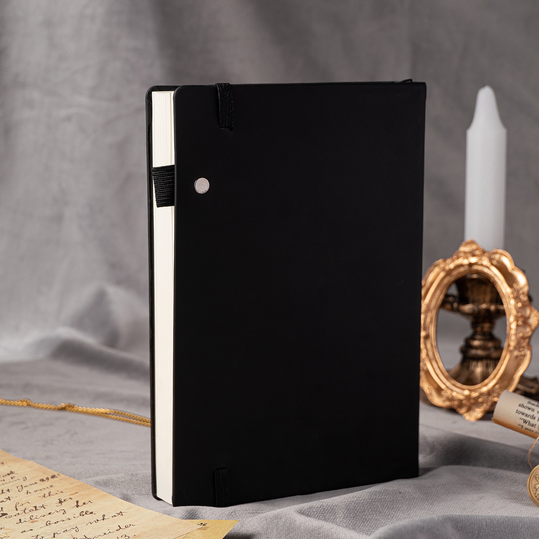 - Cover and Strap: Classic leather cover with a secure elastic strap