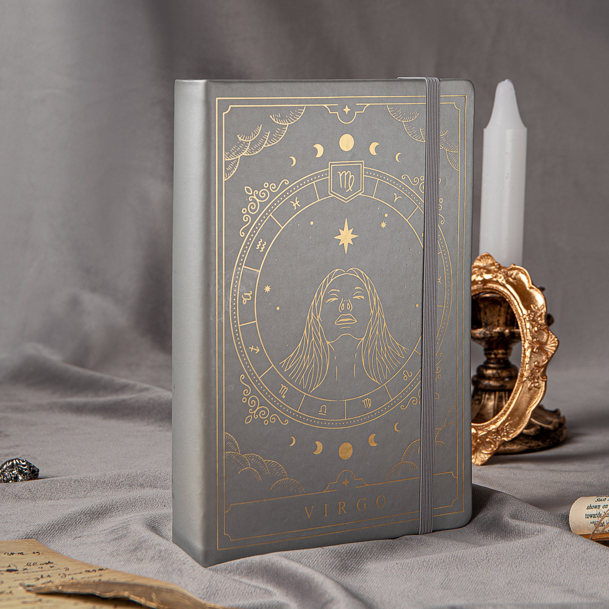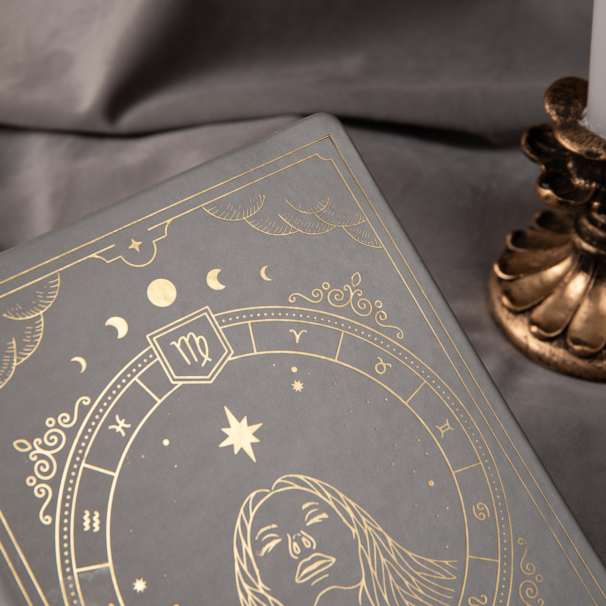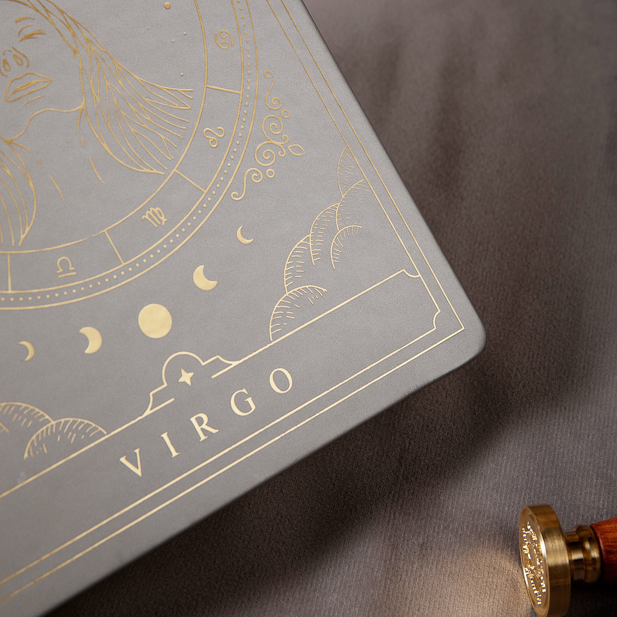 - Design Theme: Zodiac sign Virgo with gold foil astrological motifs