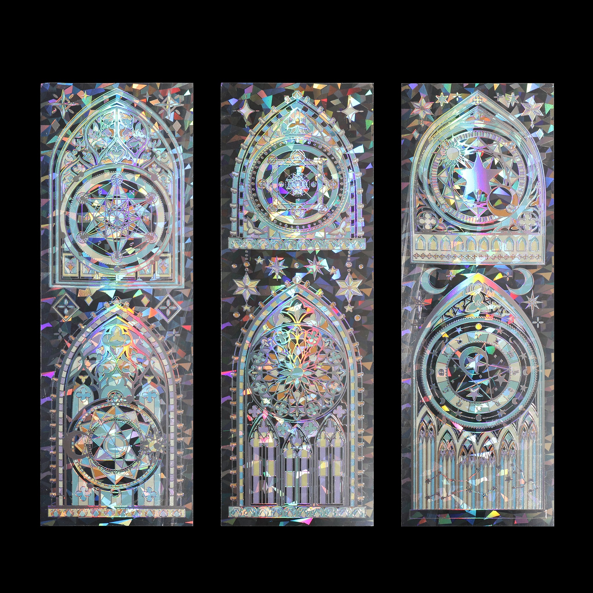 The colors of the stickers are predominantly iridescent rainbow hues, with dominant tones of blue, green, purple, pink, and gold. The holographic effect creates a prismatic, shifting appearance when light hits the surface. The design elements are a beautiful blend of architectural and celestial/circular motifs. You’ll find Gothic – style stained – glass window motifs with pointed arches, ornate borders, small arched windows, and floral patterns. Central circular designs resemble mandalas or alchemical symbols, featuring star pentagons, celestial bodies like moons and stars, and geometric grids. The intricate small shapes like triangles and diamonds form the holographic effect, with crisp, detailed borders and layered, almost “crystal – like” edges.