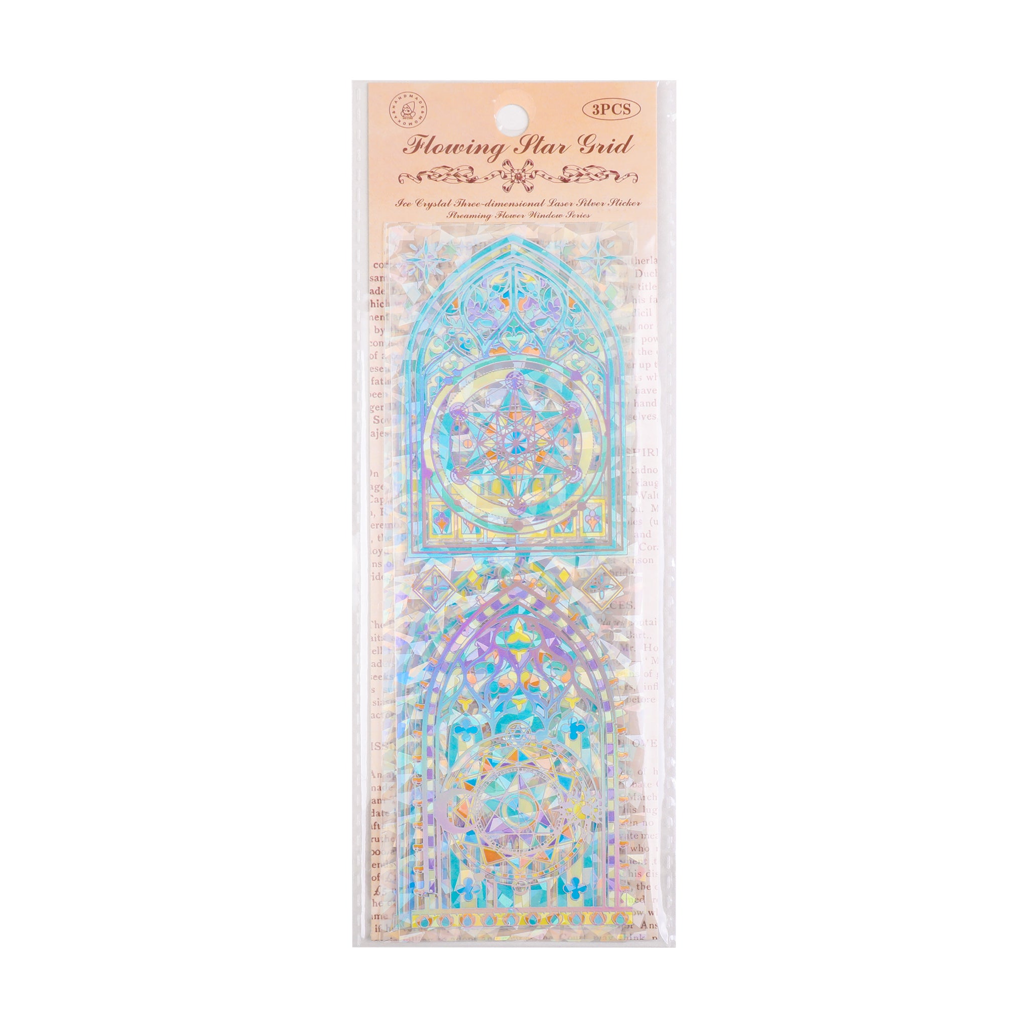 Packaged in clear plastic with a label reading “Flowing Star Grid” and “Ice Crystal Three – dimensional Laser Holographic Stickers”, these stickers are presented in a way that highlights their decorative potential. They are perfect for those who love gothic, celestial, or magical aesthetics and can be used to embellish cards, envelopes, phone cases, laptop covers, and more.