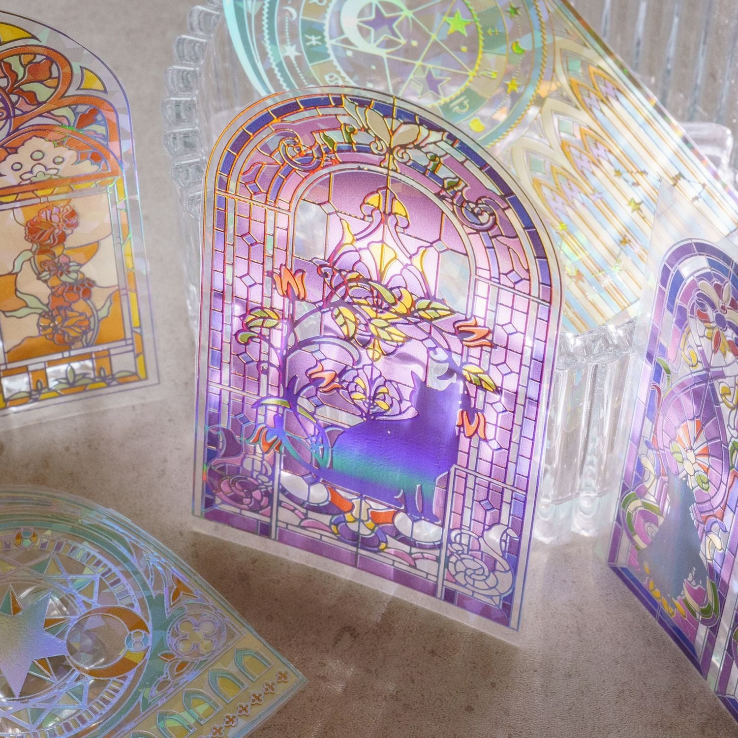 In terms of quality, the printing precision is top – notch, with fine details like tiny floral petals and geometric lines being crisp and free from smudging or color bleeding. The holographic layer is evenly applied and can resist minor wear, thanks to the glossy finish and protective packaging. The elaborate stained – glass motifs are a testament to high – quality printing techniques.