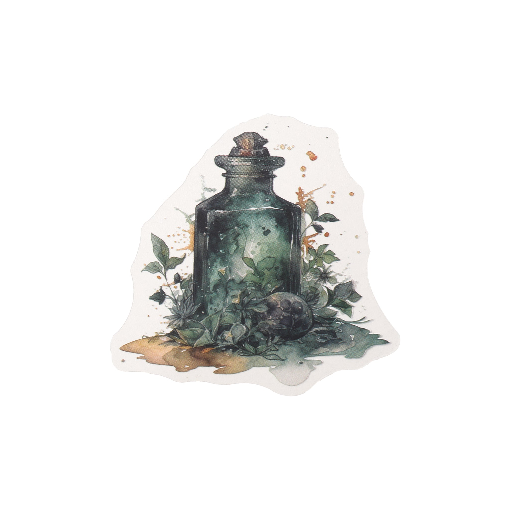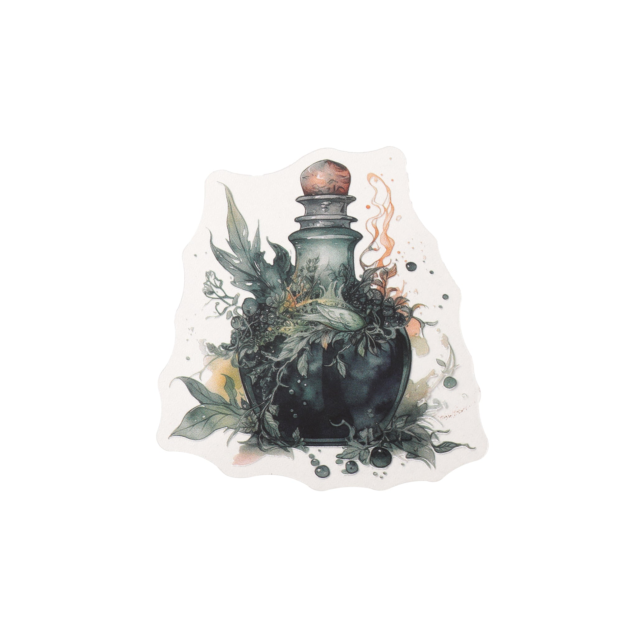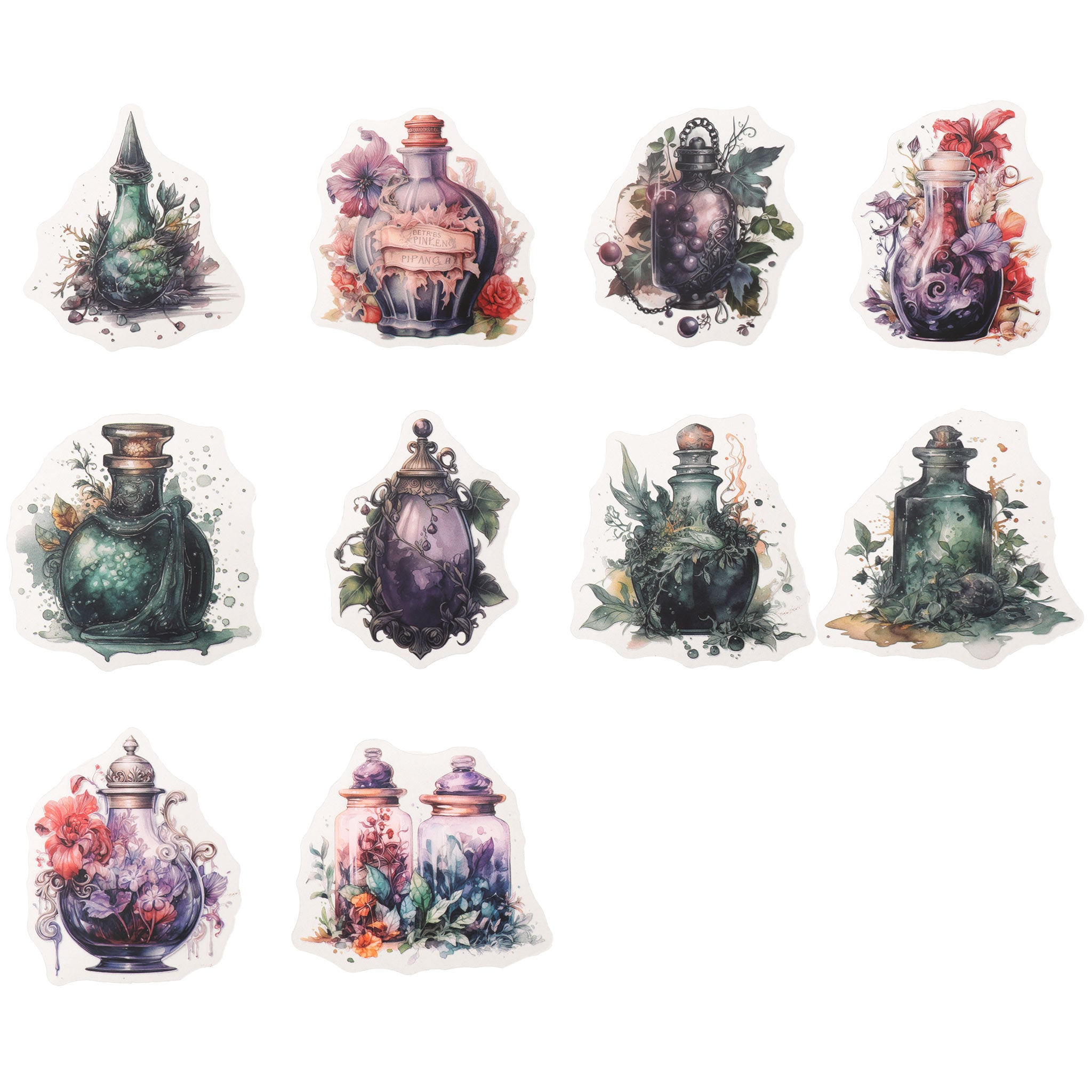 The individual stickers vary in size, ranging from 2–4 inches (5–10 cm) in height/width, and have irregular, organic white cutouts with no solid borders, making them surface – friendly for various applications. The set contains 9–10 distinct designs with unique potion themes, like grape – filled, vine – wrapped, and flower – embedded bottles.