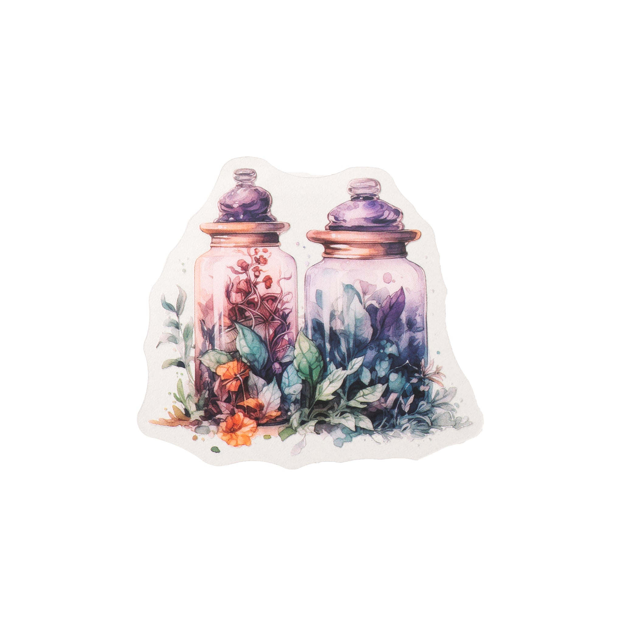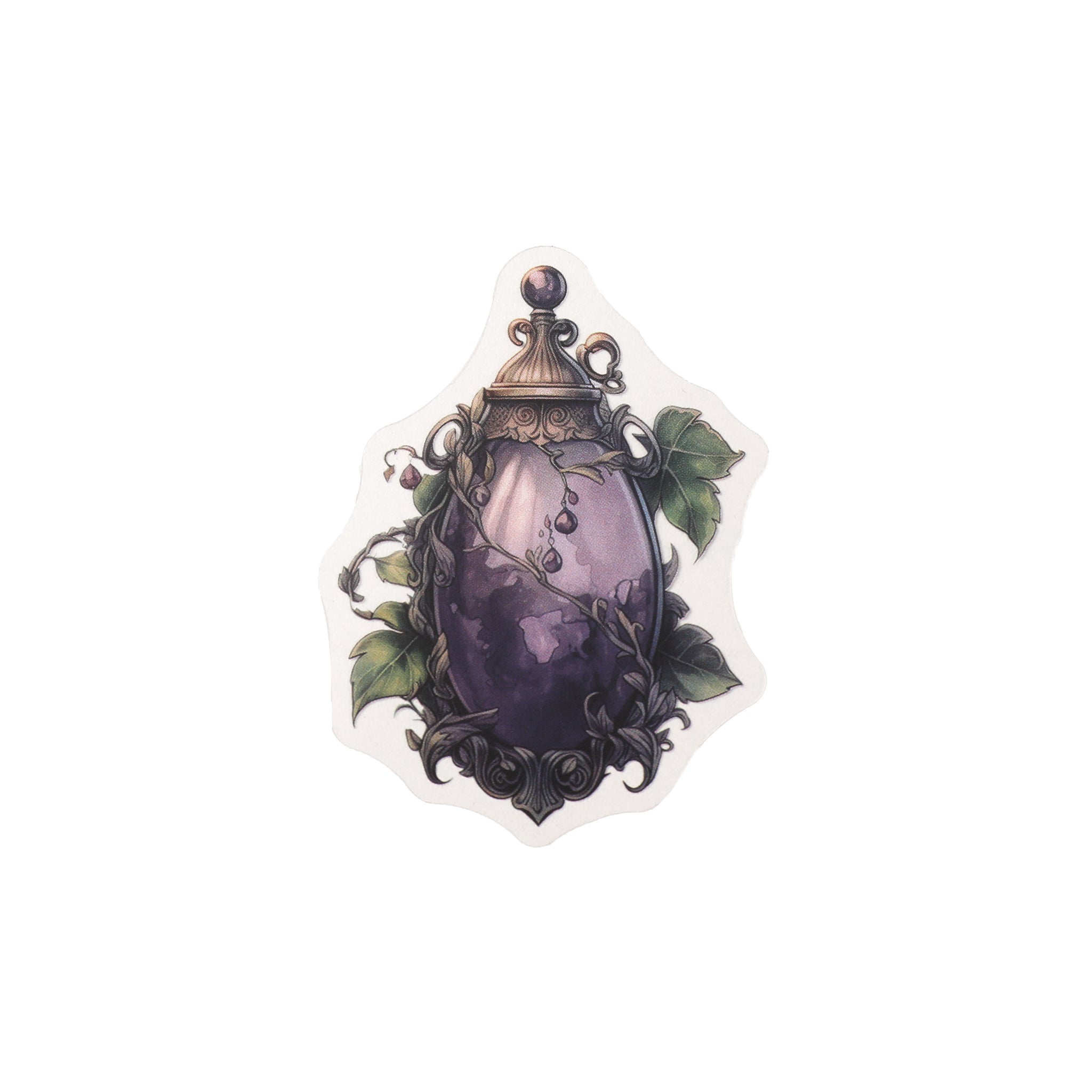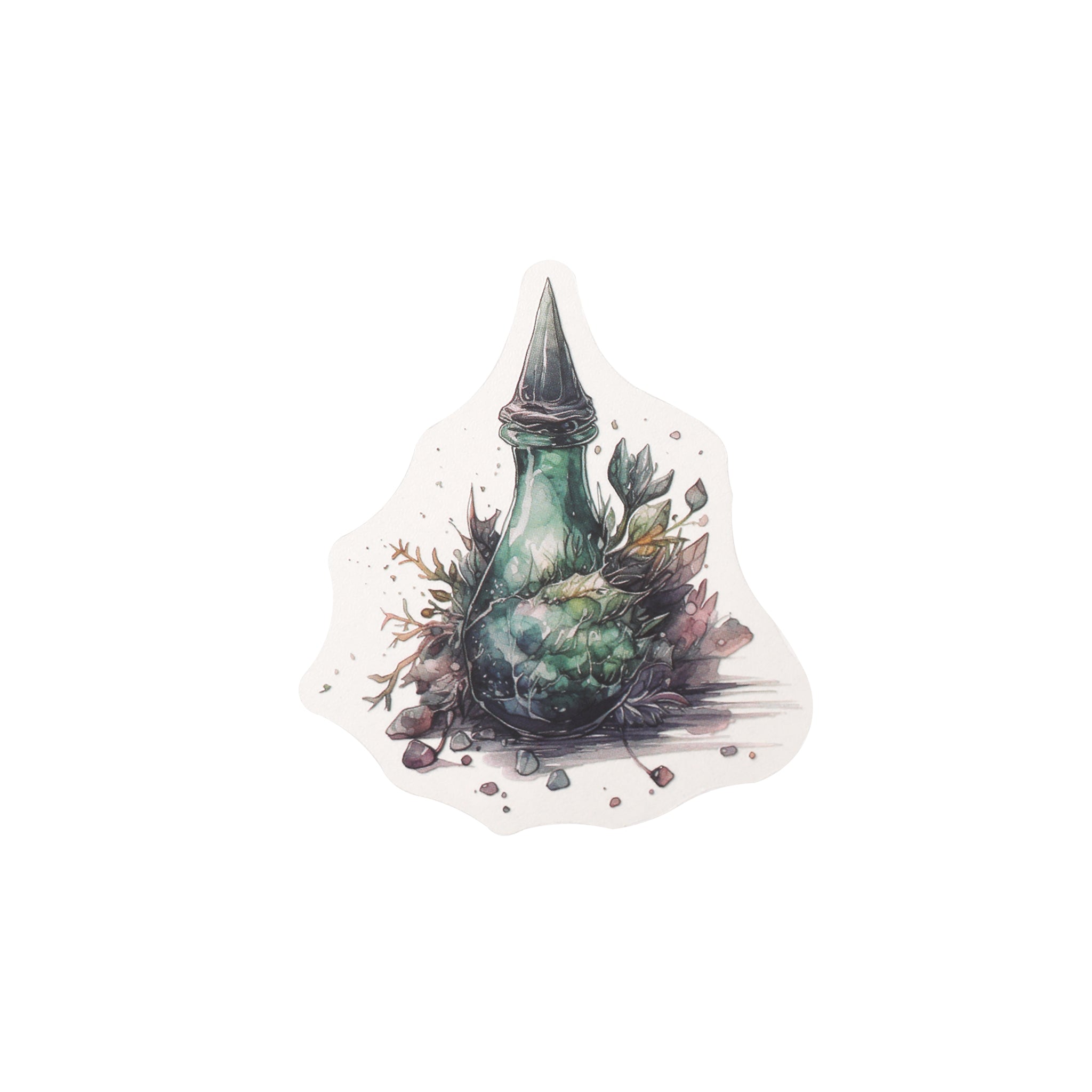 The individual stickers vary in size, ranging from 2–4 inches (5–10 cm) in height/width, and have irregular, organic white cutouts with no solid borders, making them surface – friendly for various applications. The set contains 9–10 distinct designs with unique potion themes, like grape – filled, vine – wrapped, and flower – embedded bottles.