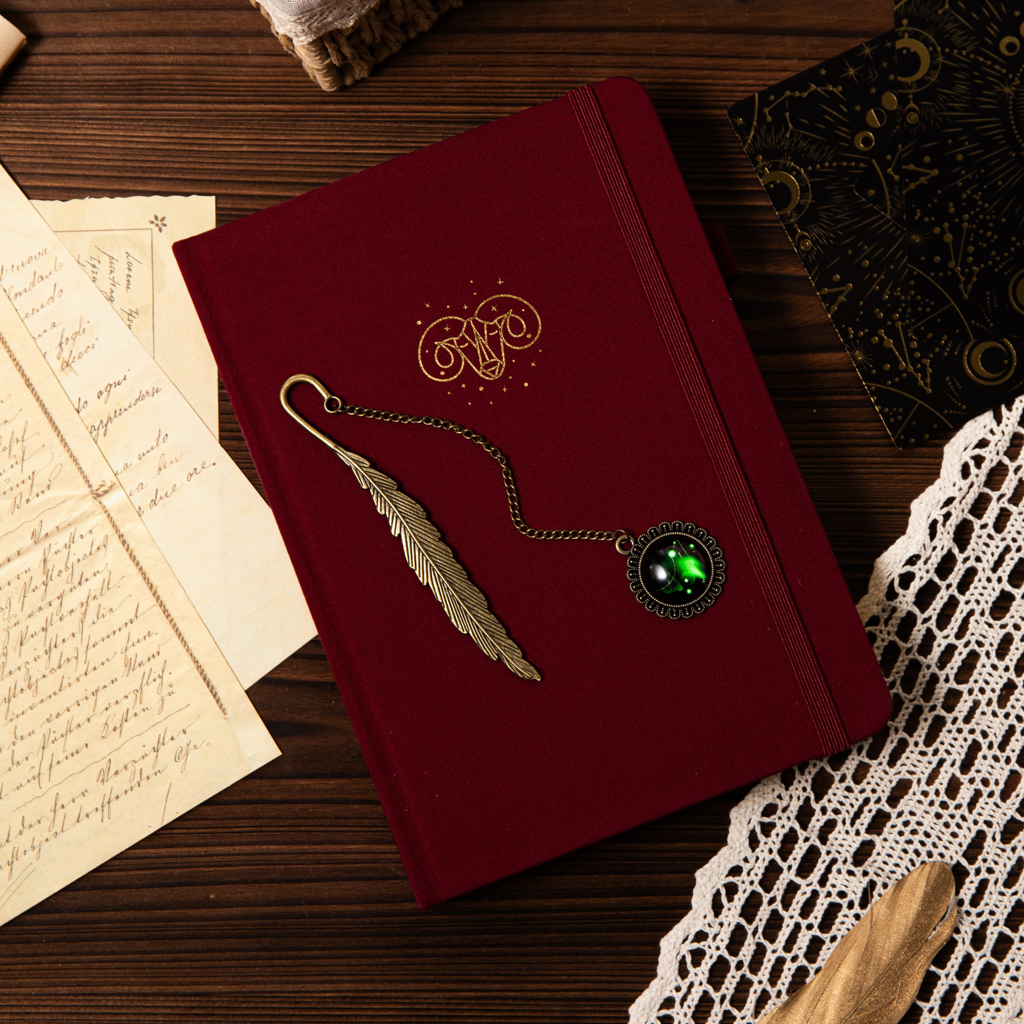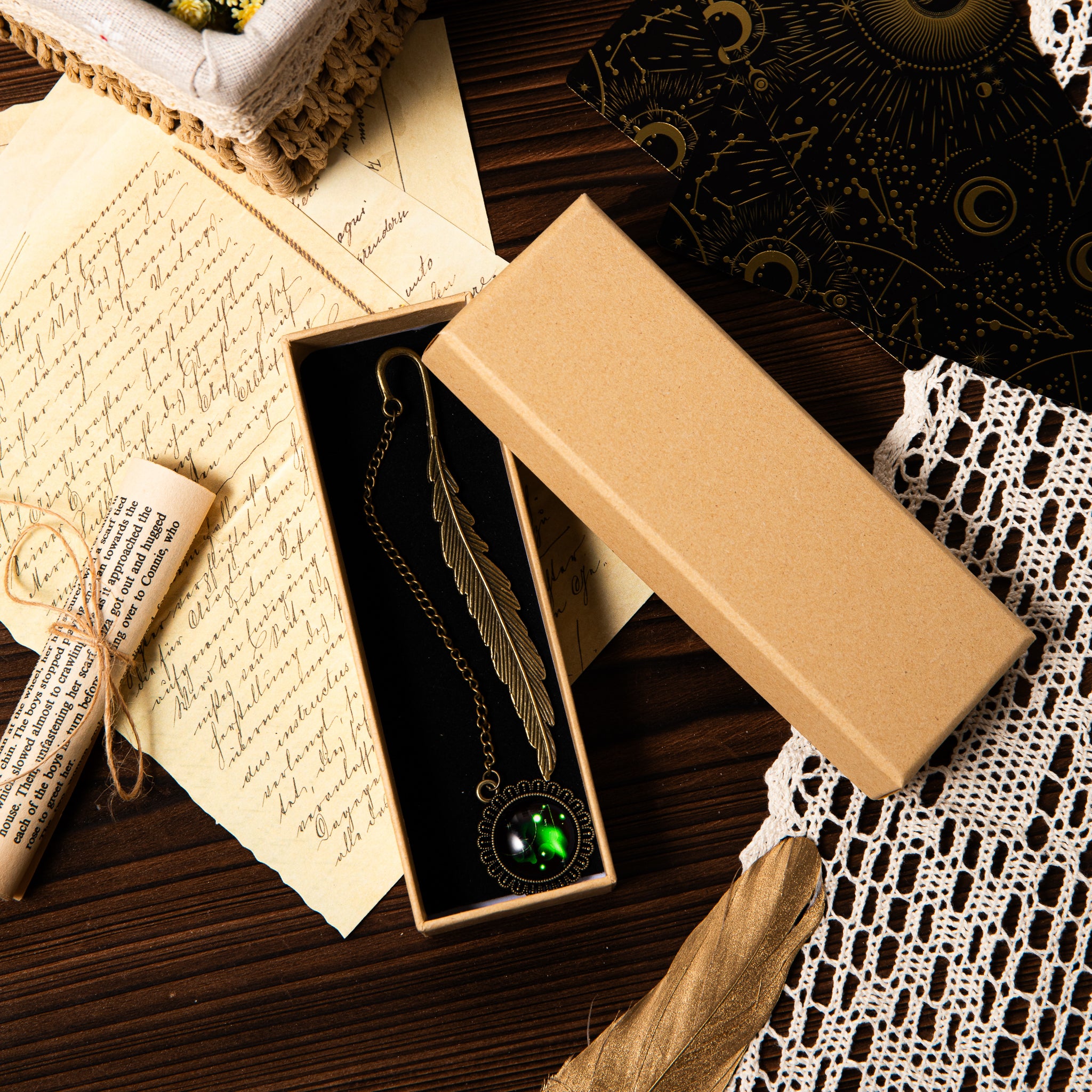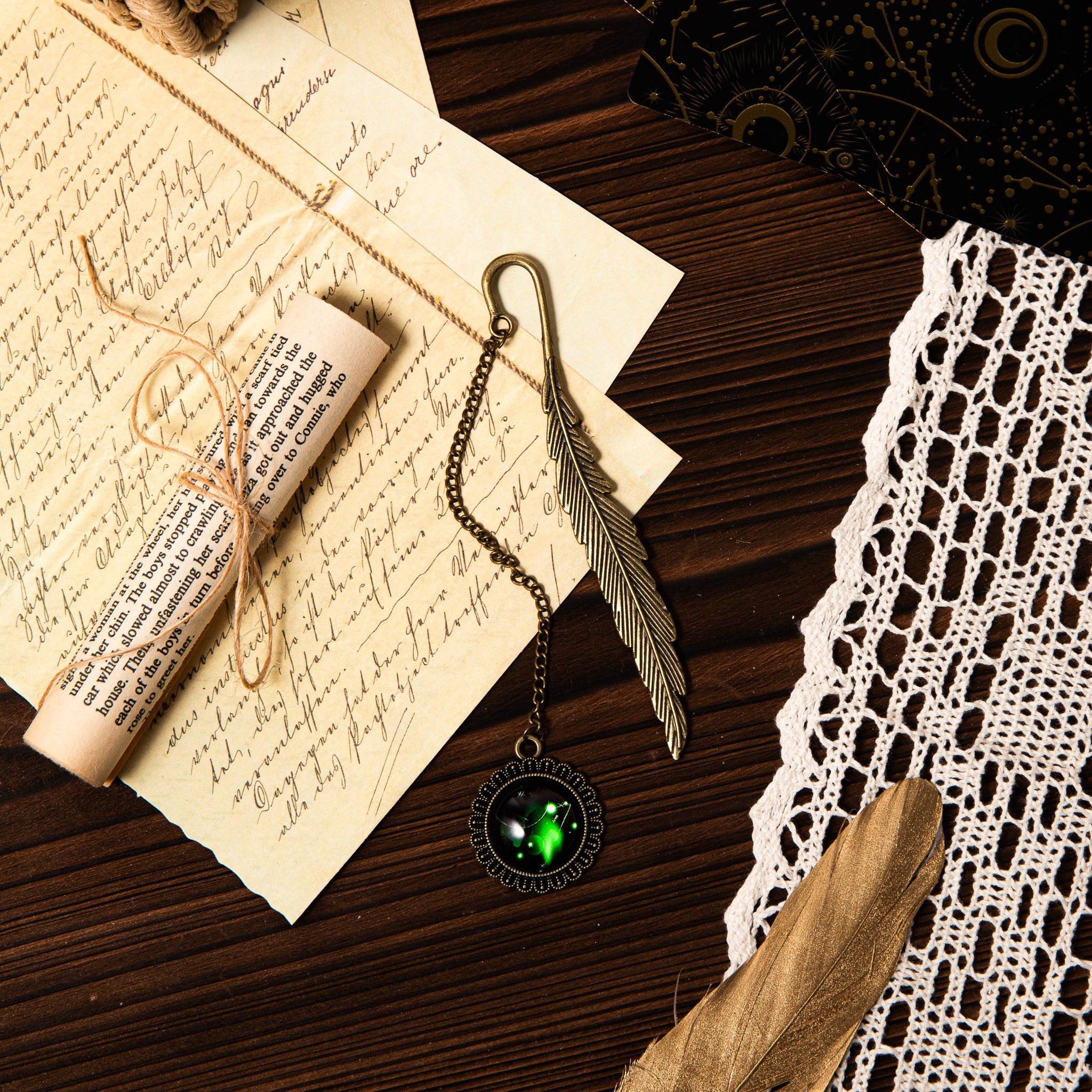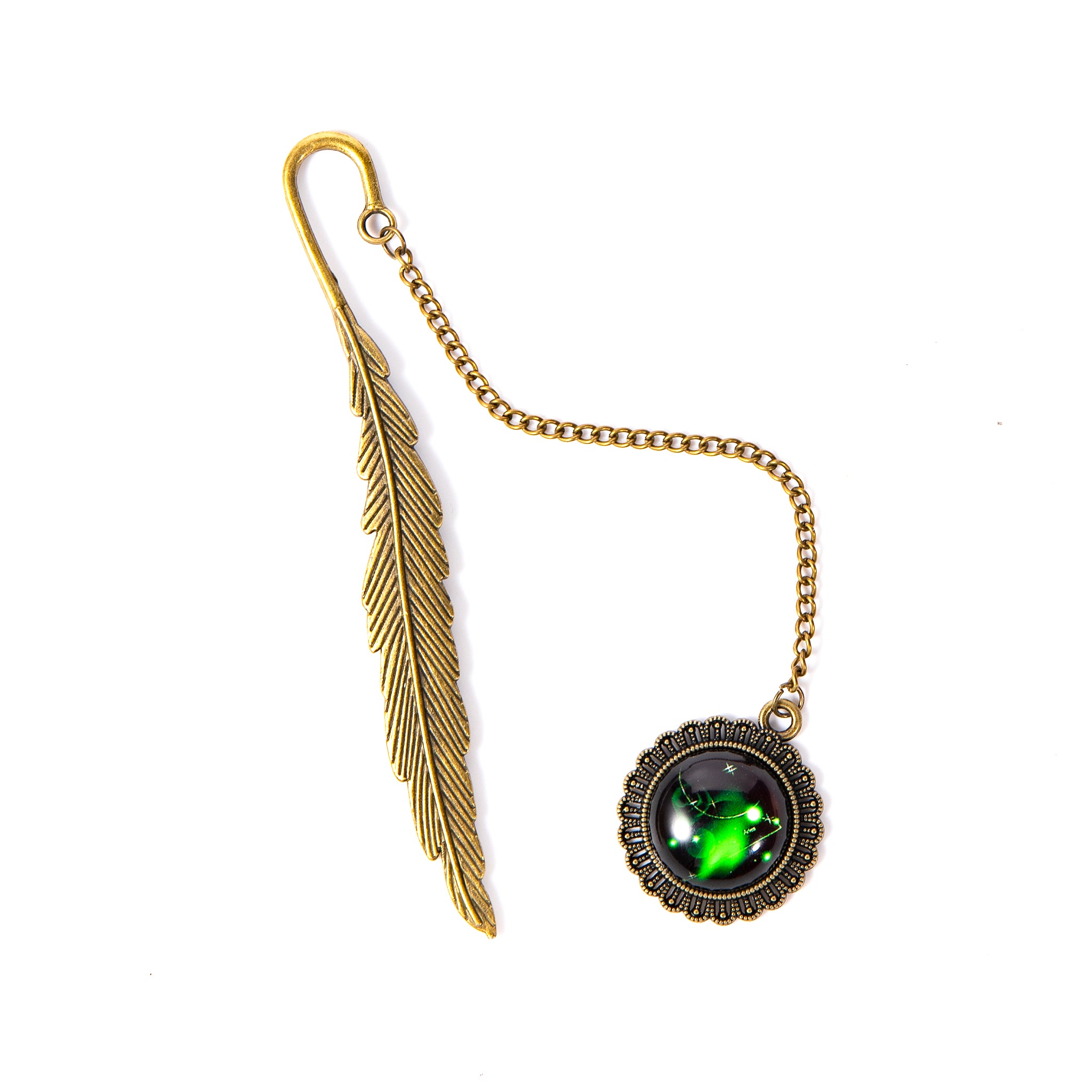 - Design: Vintage/steampunk style with a feather shape, chain, hook, and an ornate pendant featuring a glowing green celestial orb