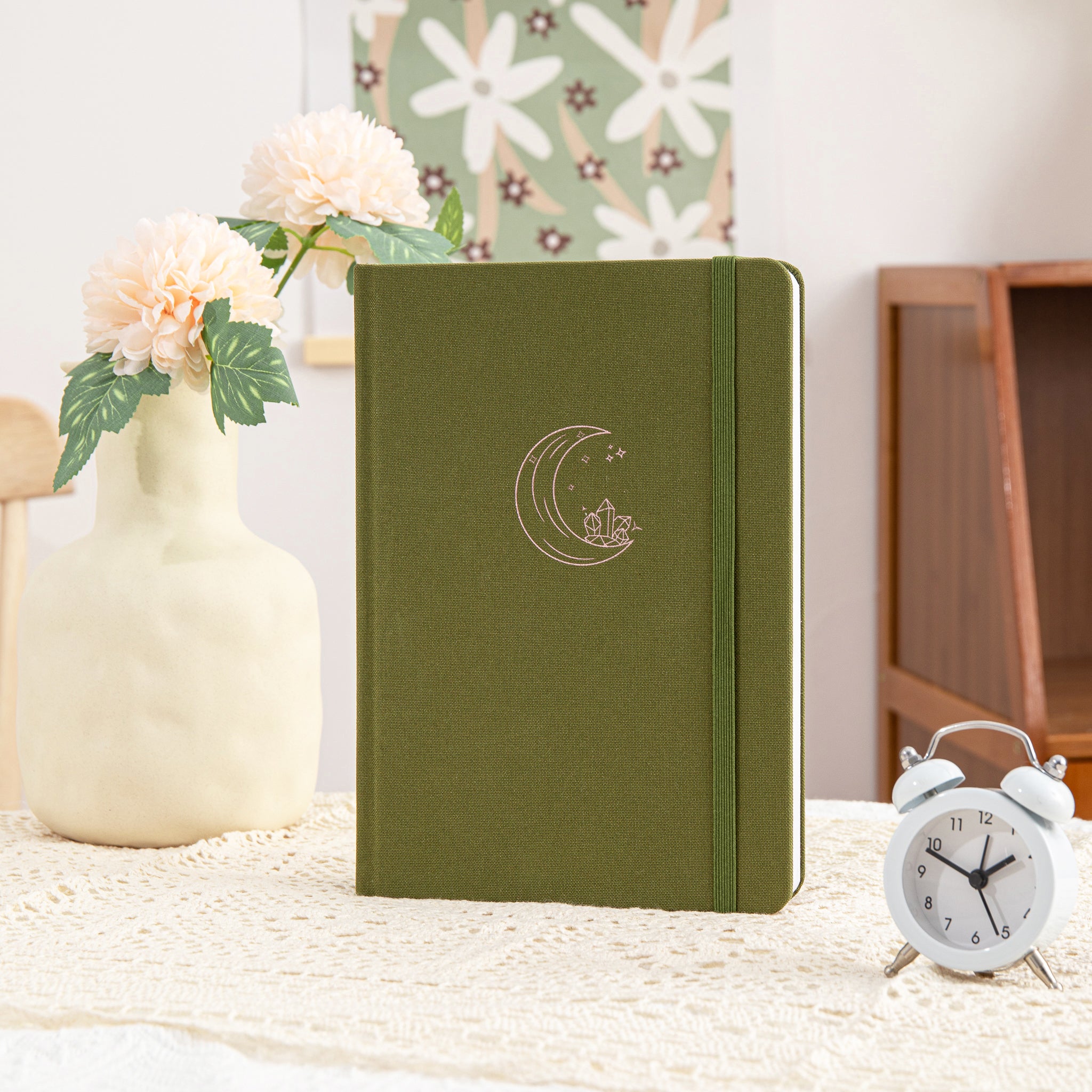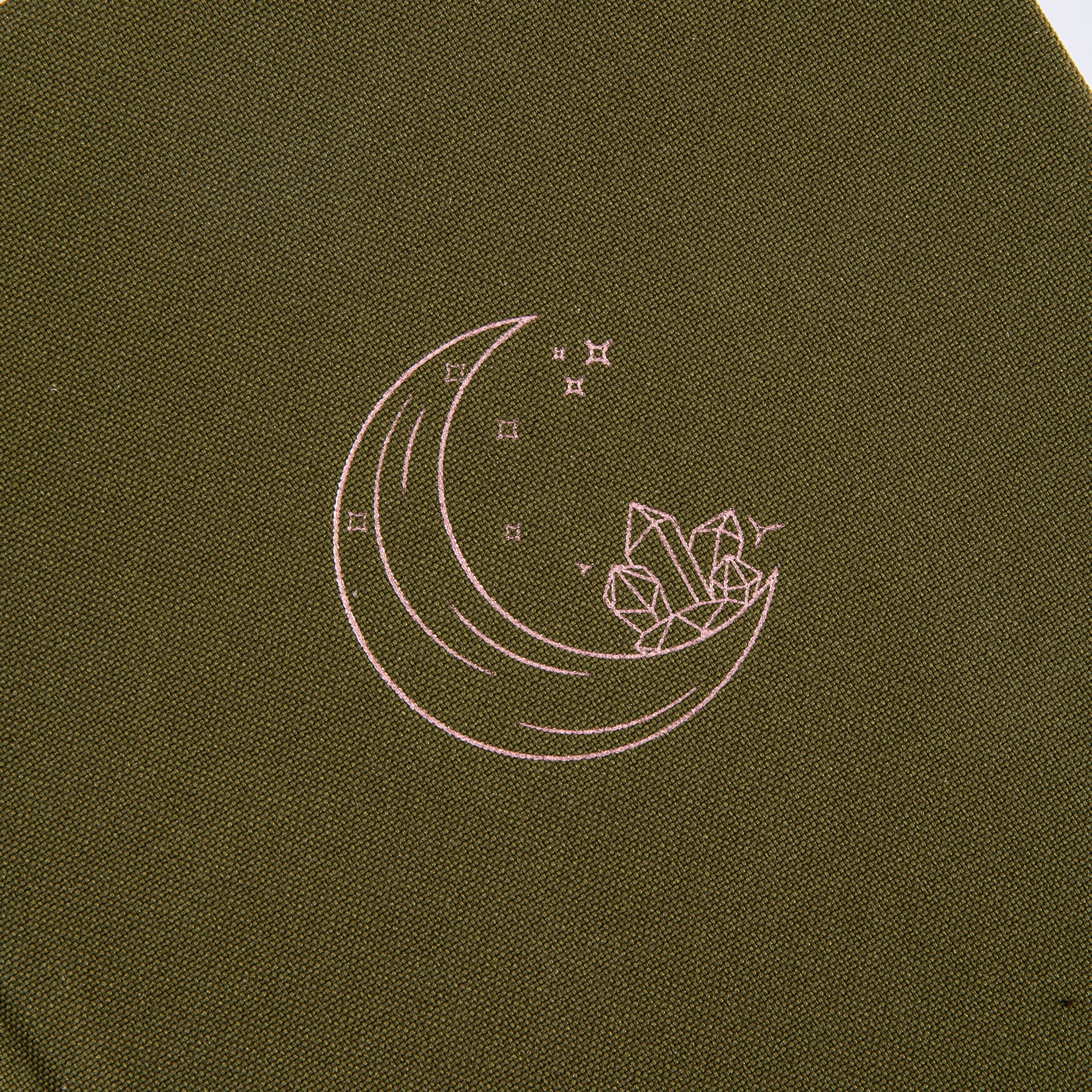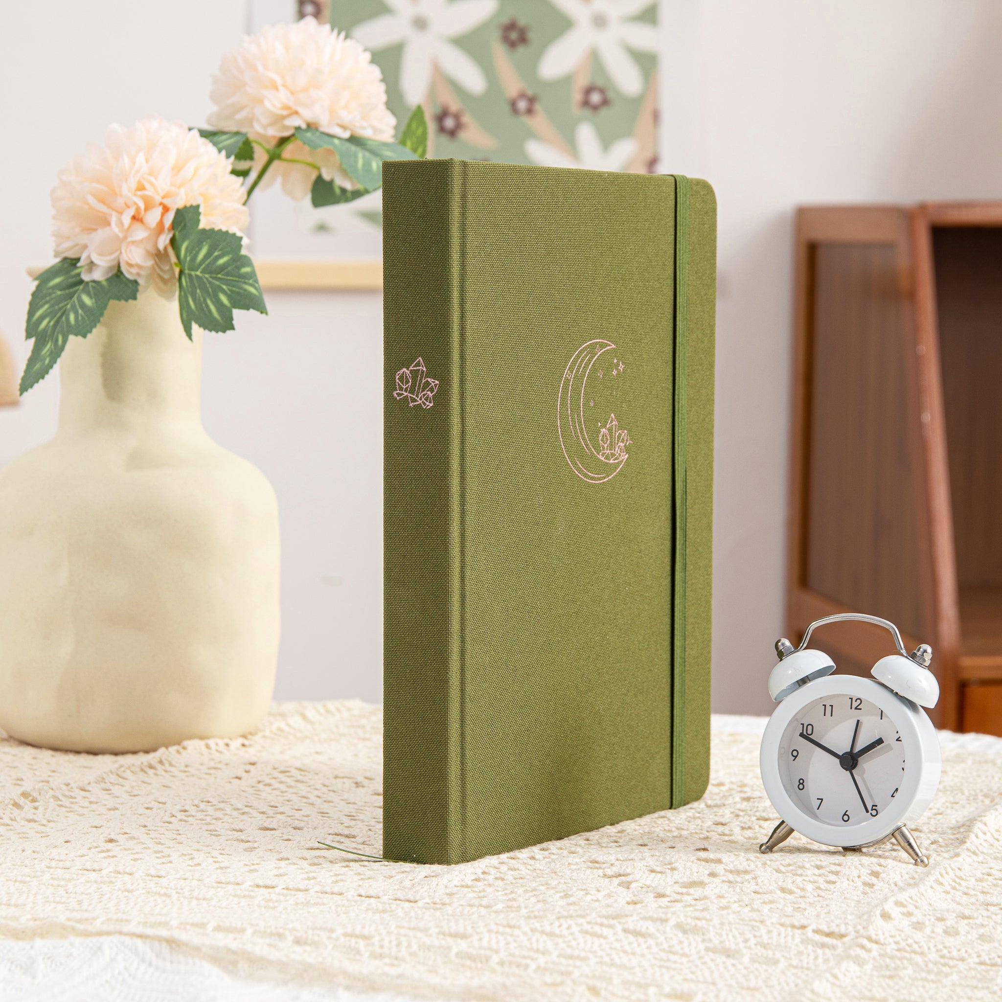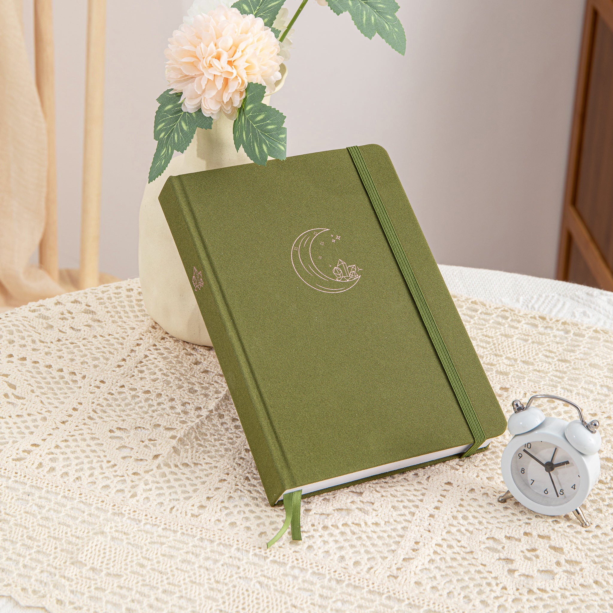 - Cover Material: Textured, fabric – like or synthetic leather with olive green color and pink embroidery of crescent moon + crystals