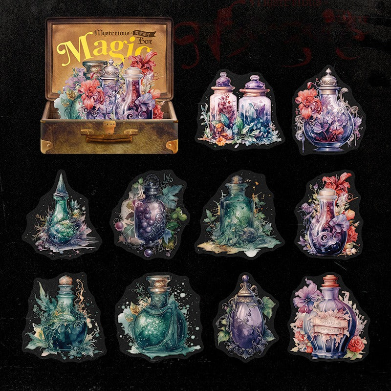 The stickers are small to medium – sized, fitting within 2–4 inches (largest dimension). Each “Magic Box” is a compact, vintage – style case that holds 10–12 individual stickers per set. There are 6 distinct “Magic Box” variants, including “魔力玫瑰” (Magic Roses), “魔法瓶子” (Magic Potions), and “女巫之猫” (Witch’s Cat), offering a wide range of options for your creative projects.