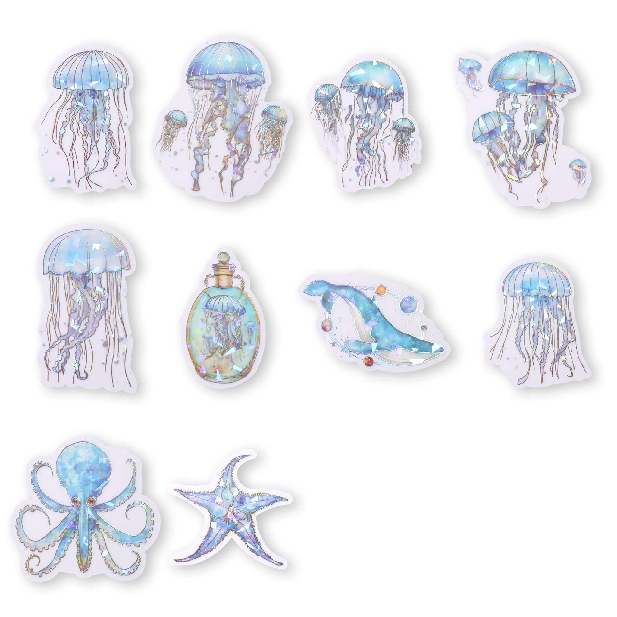 The color palette is dominated by warm golds/yellows and cool blues/teals, creating a dreamy, underwater aesthetic. Accents of pink, green, and white add to the detailed look. The intricate, mosaic – like designs have a “stained – glass” effect with faceted, jewel – toned details. Key elements include delicate jellyfish with iridescent bell – shaped bodies, stylized starfish with a flower – like, gem – centered pattern, an octopus with curled tentacles and lace – like details, a whale with a celestial theme of planets and stars around its body, and a glass jar enclosing a jellyfish for a “treasure” vibe. The style is whimsical and fantasy – inspired, combining a watercolor/painterly texture with holographic shimmer.