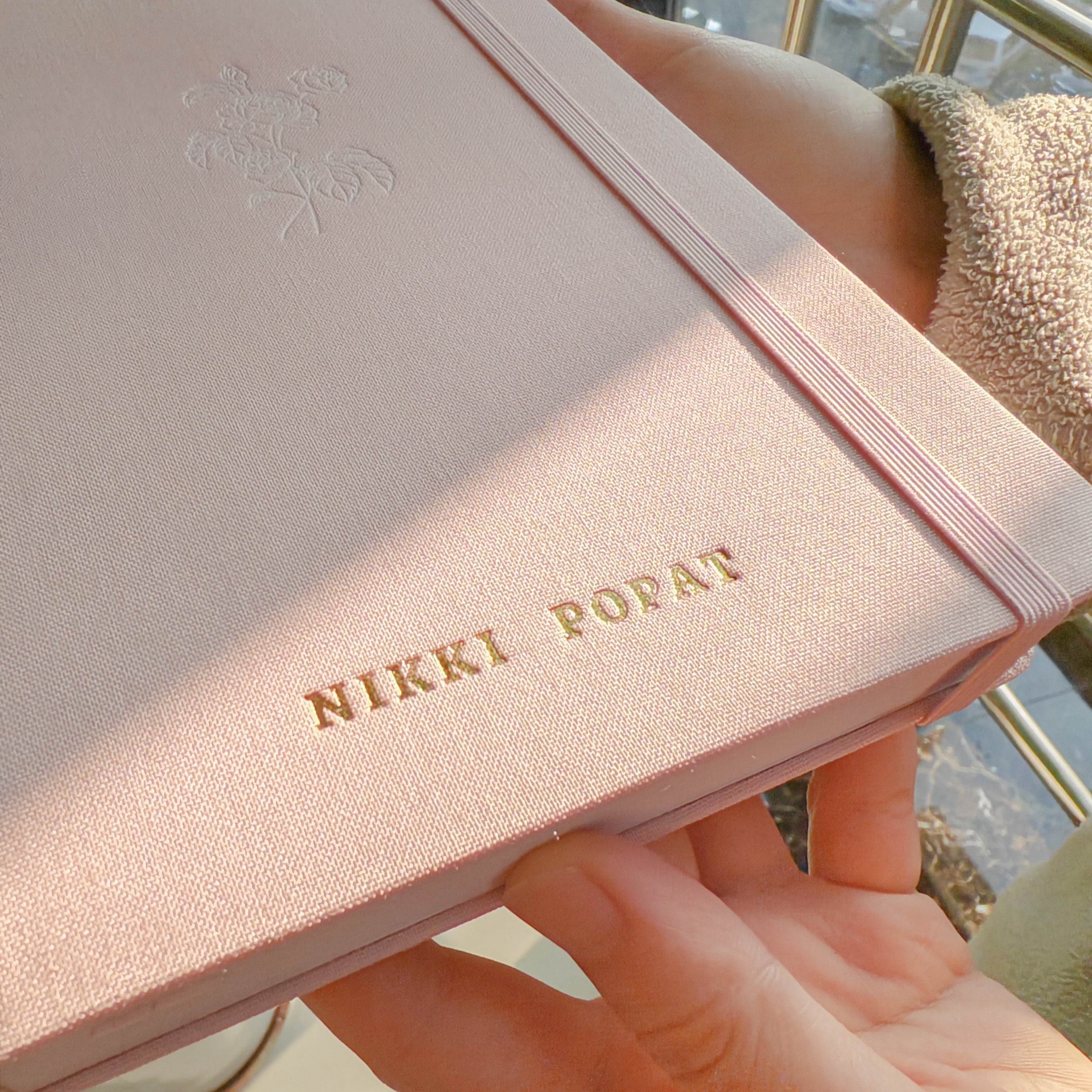 For easy organization, the notebook comes with multiple satin or silk ribbon markers in colors like pink and light gray for quick page indexing. An elastic band closure secures the journal shut, preventing pages from falling out. And with the option of gold foil personalization, you can add a name or monogram, like “NIKKI POPAT”, making it a truly unique item.
