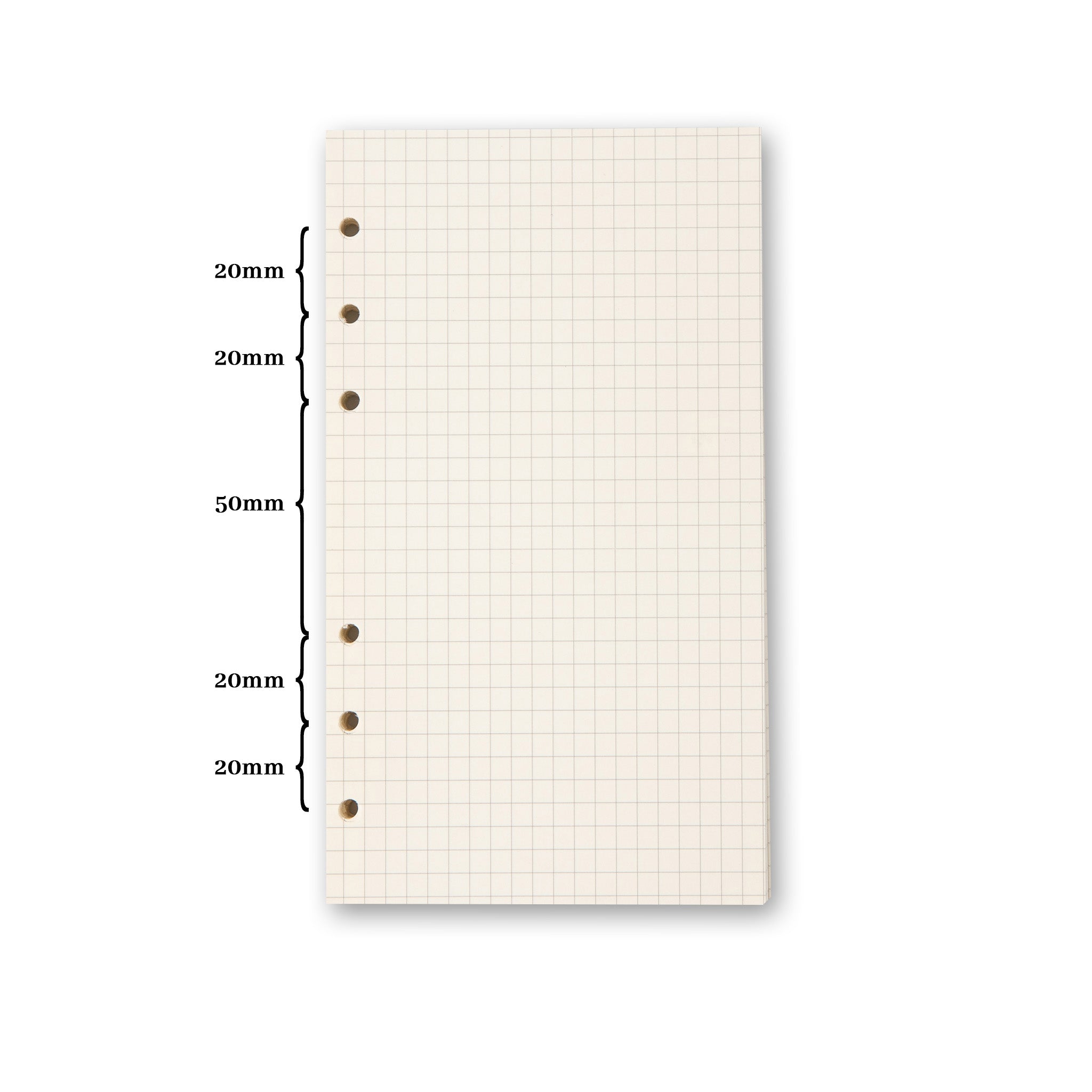 - Holes: 7 holes for A6 ring – binding, with precise 20mm, 20mm, 50mm, 20mm, 20mm, 20mm vertical spacing