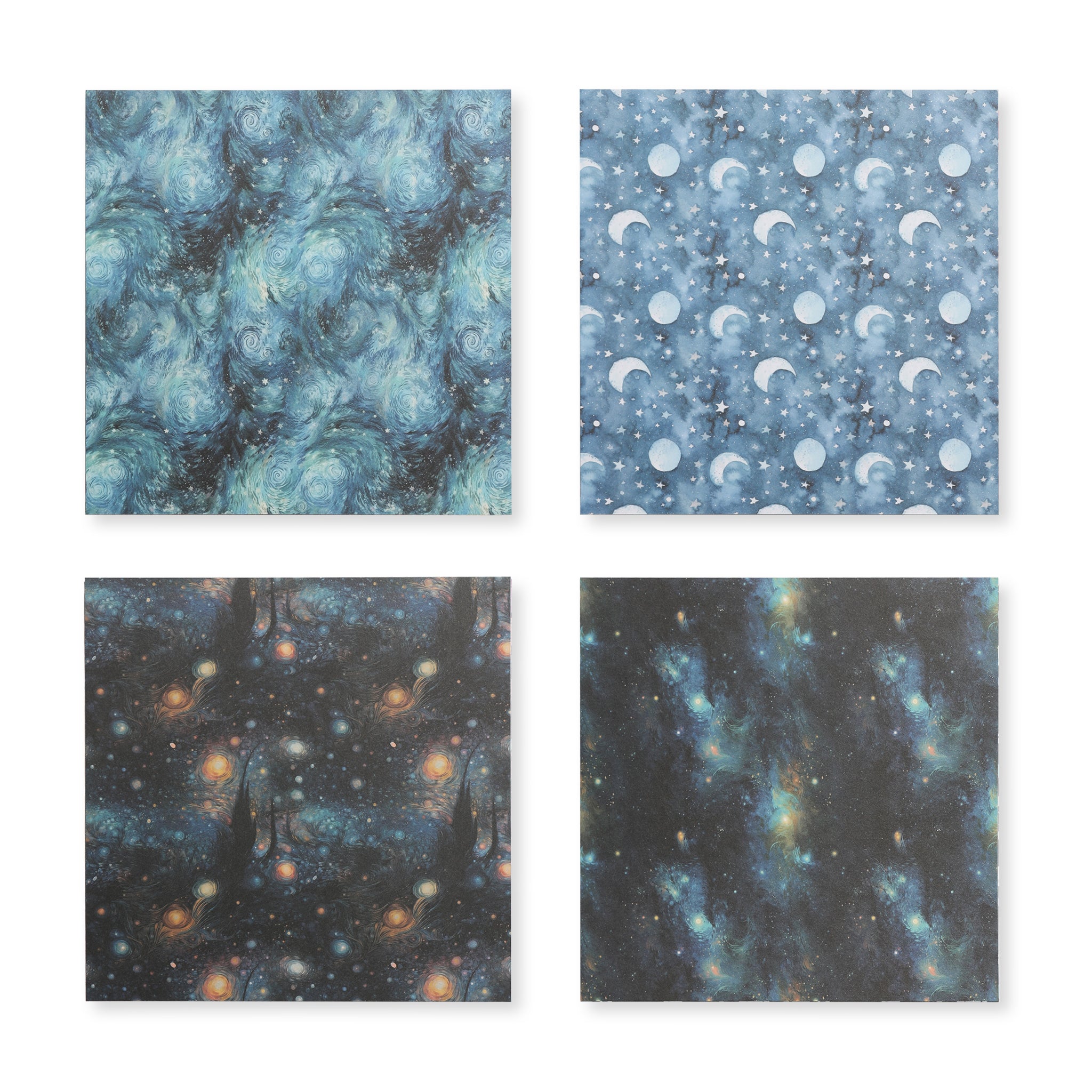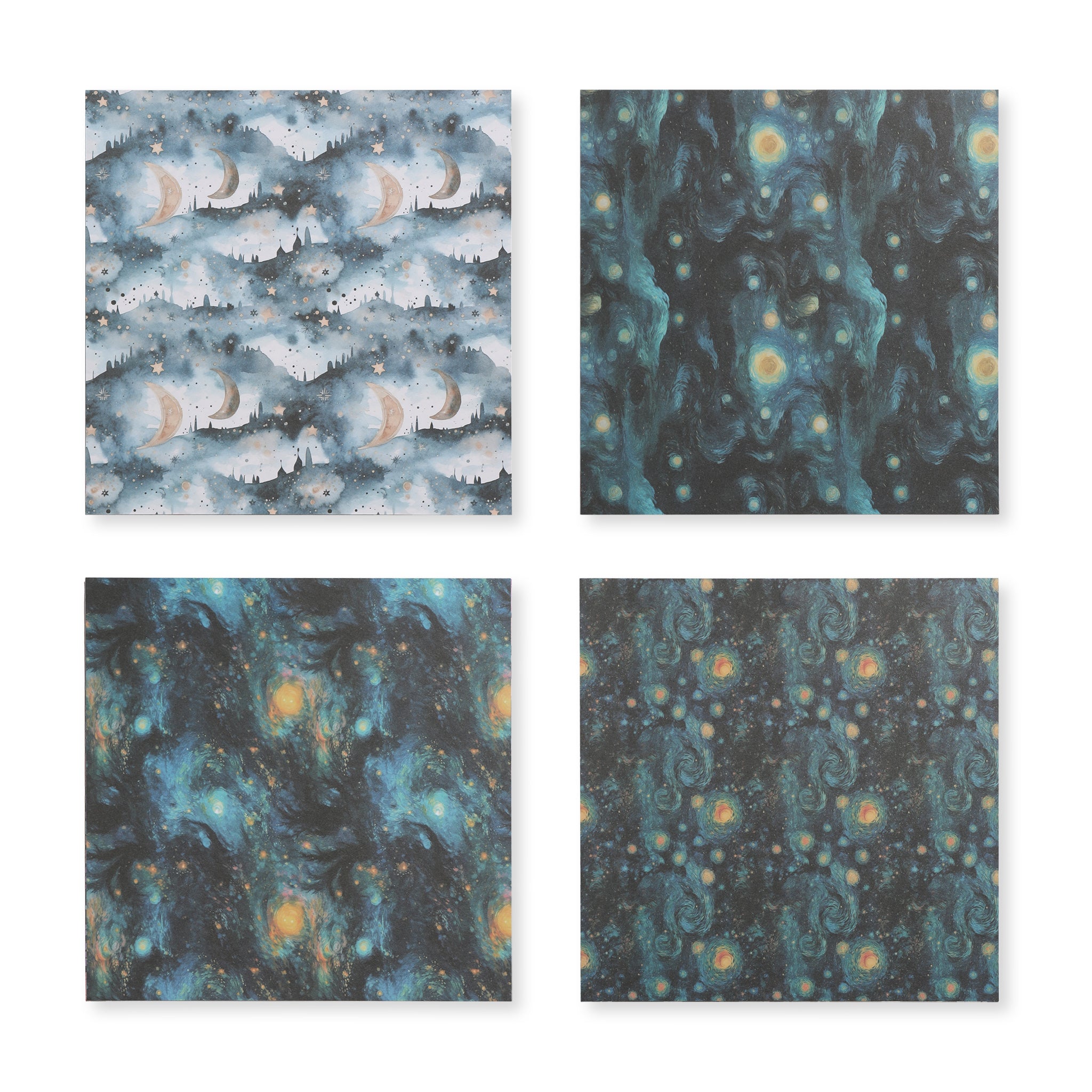 - Designs: Diverse celestial themes including swirling starry skies, crescent moons with stars, nighttime landscapes with castle silhouettes, and abstract nebulae