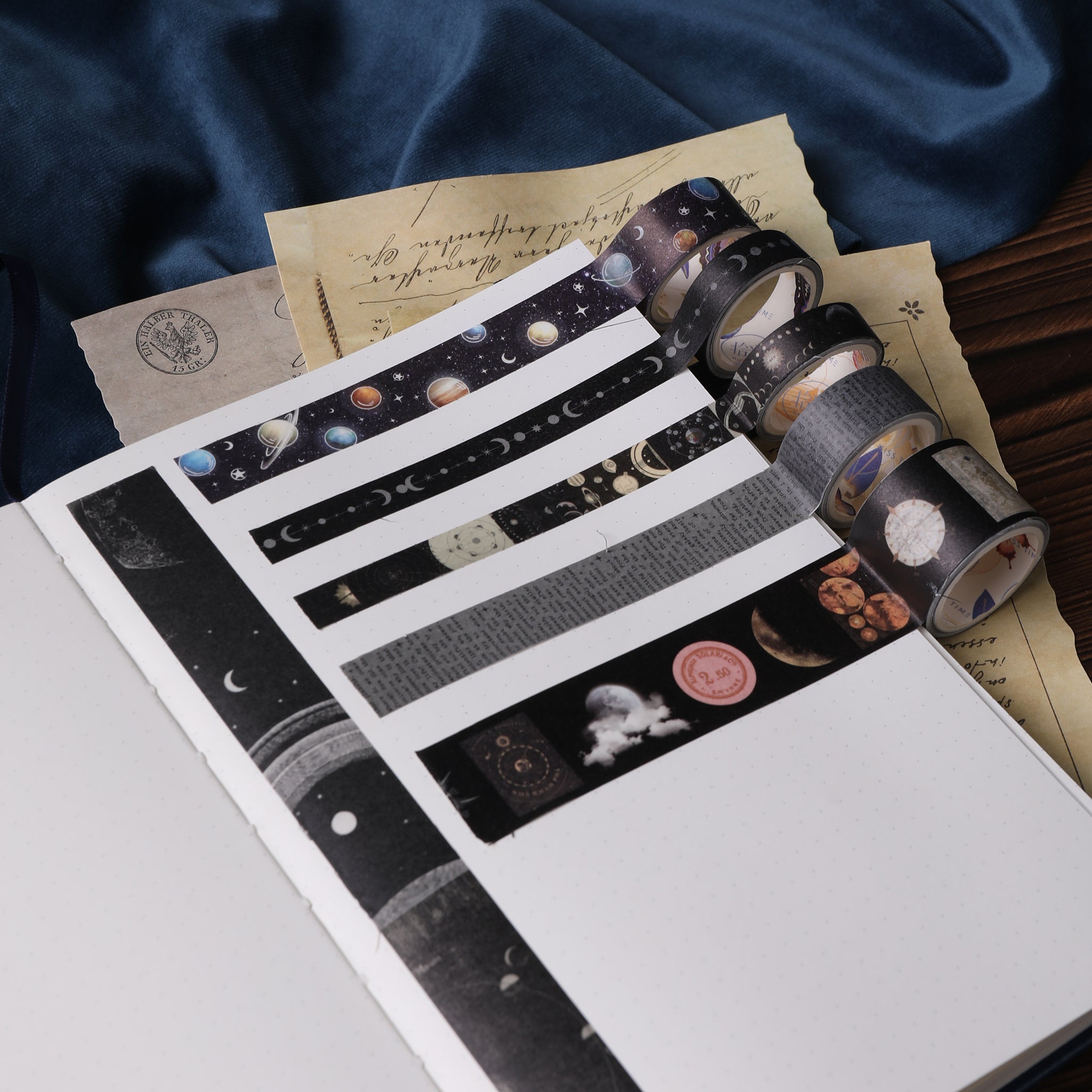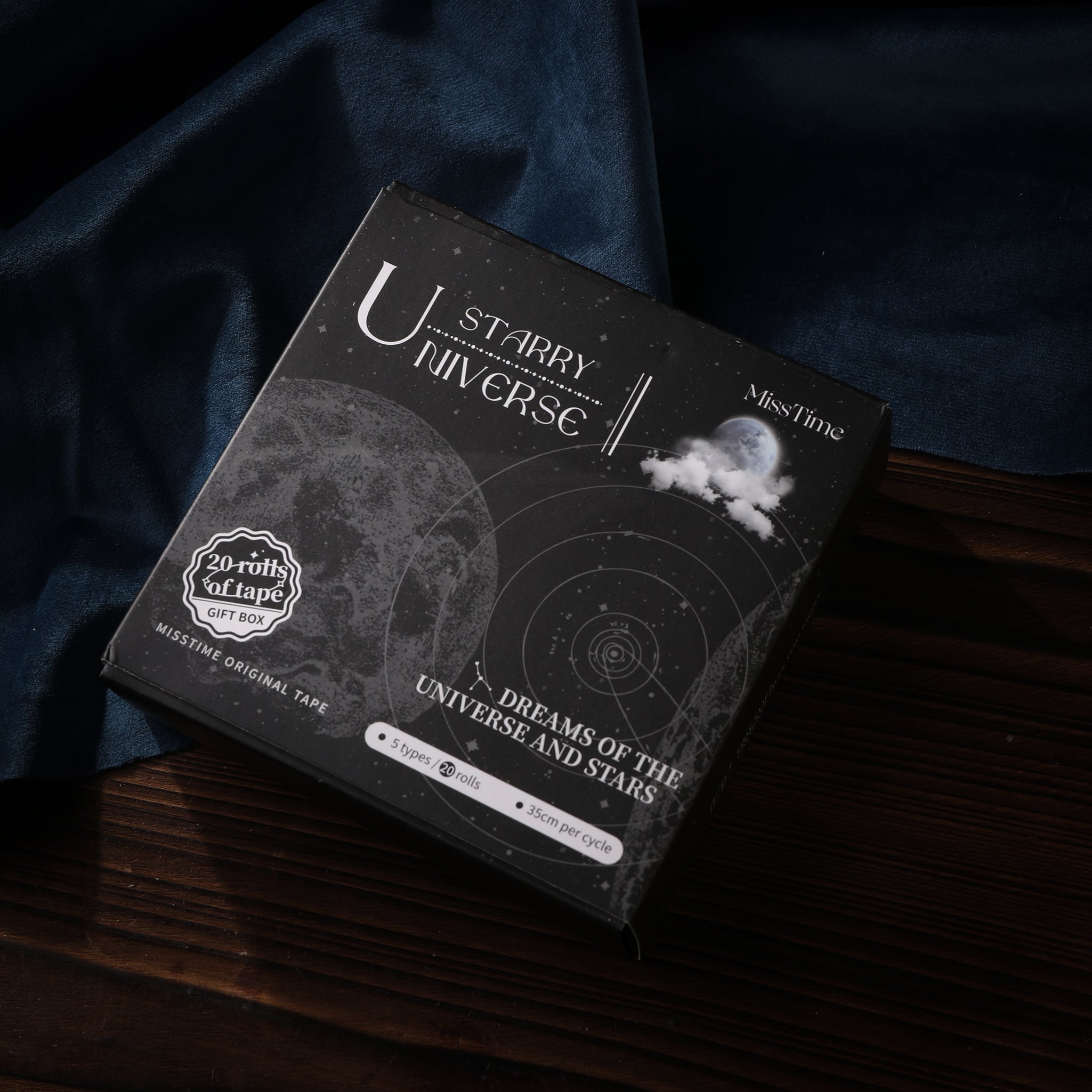 - Materials: Rigid, matte – finish cardboard box; Washi paper tape rolls with a smooth, matte finish; Dark blue, velvety/silk – like fabric backdrop