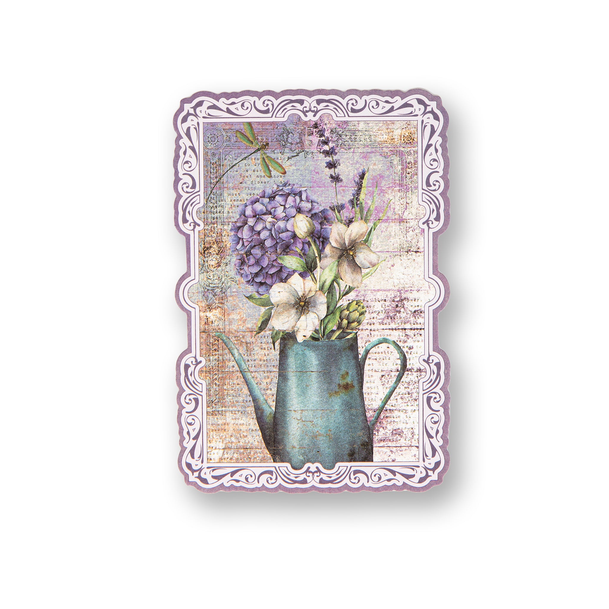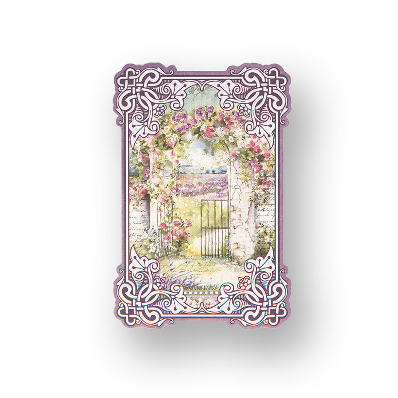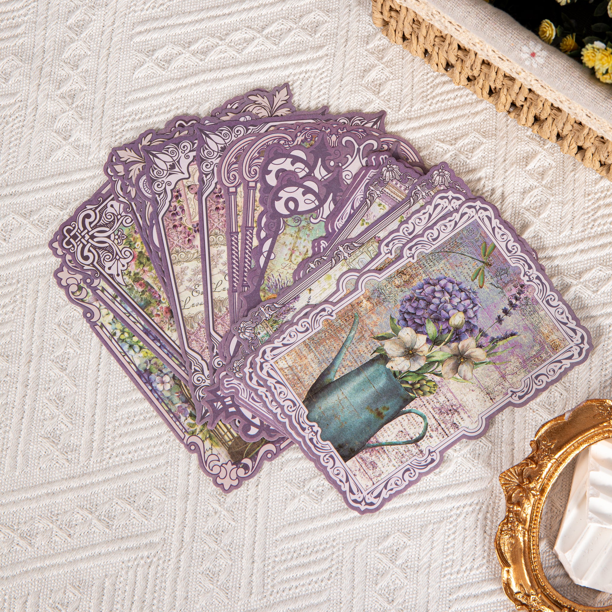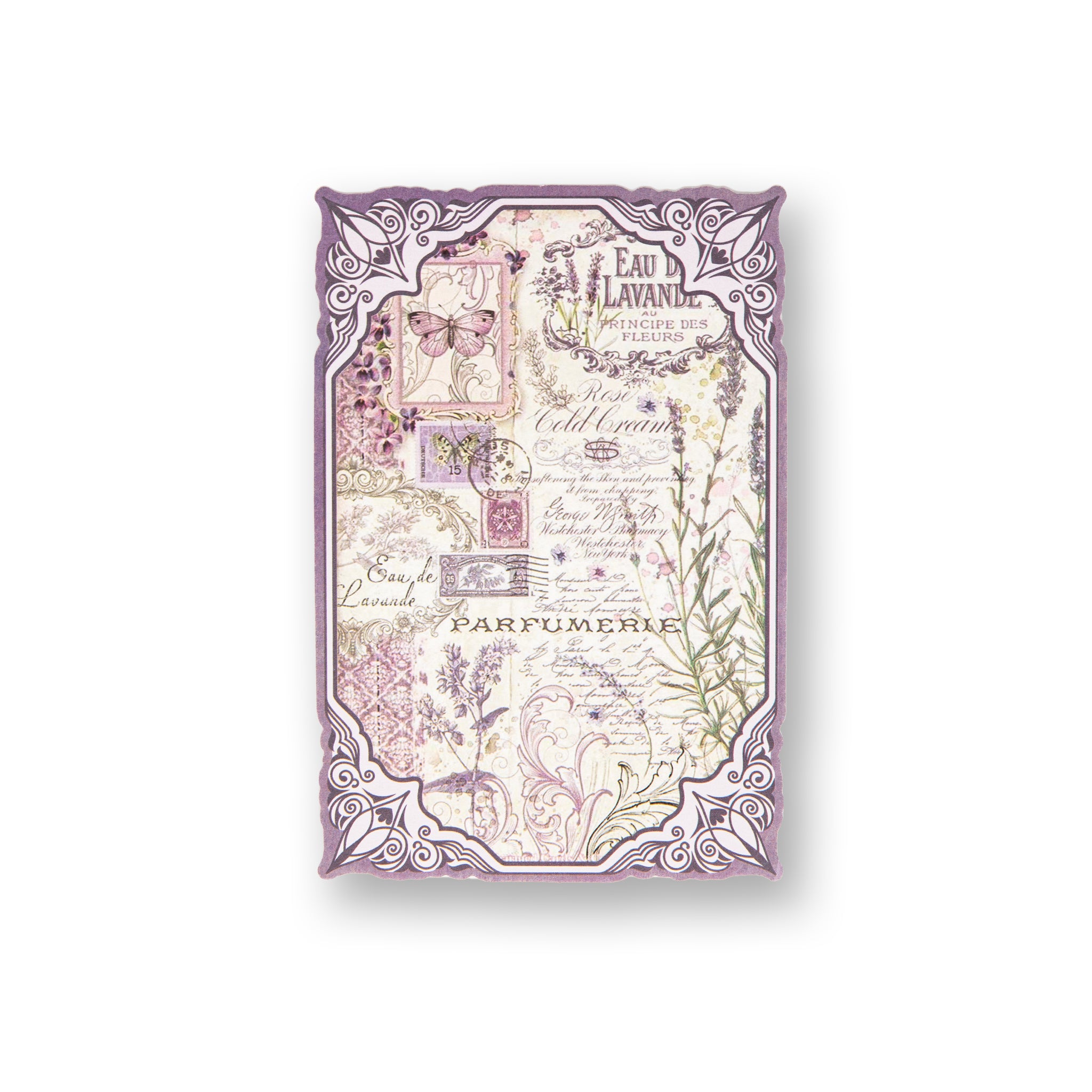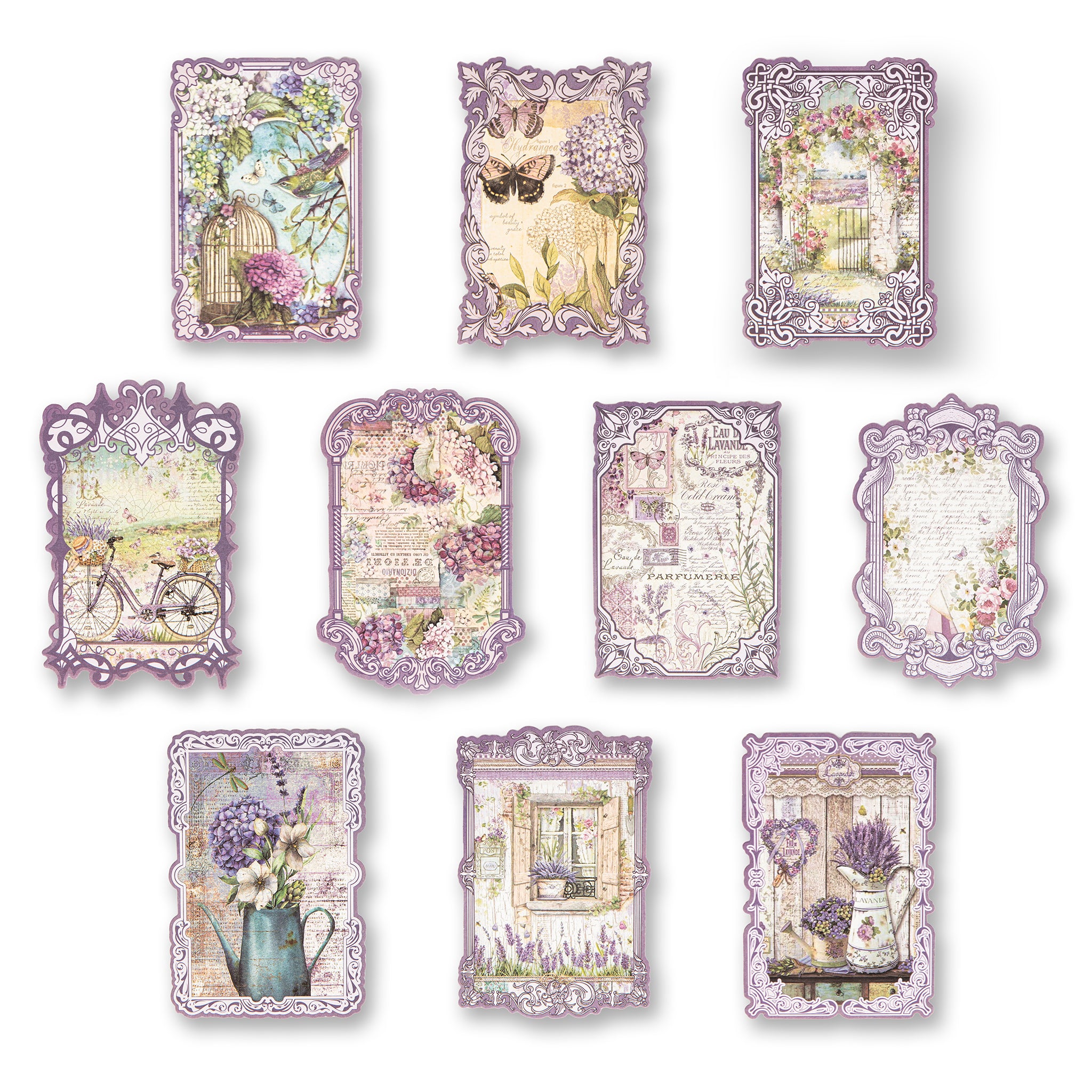 - Central Motifs: Lavender arrangements, a window with shutters, hydrangeas, and French text
