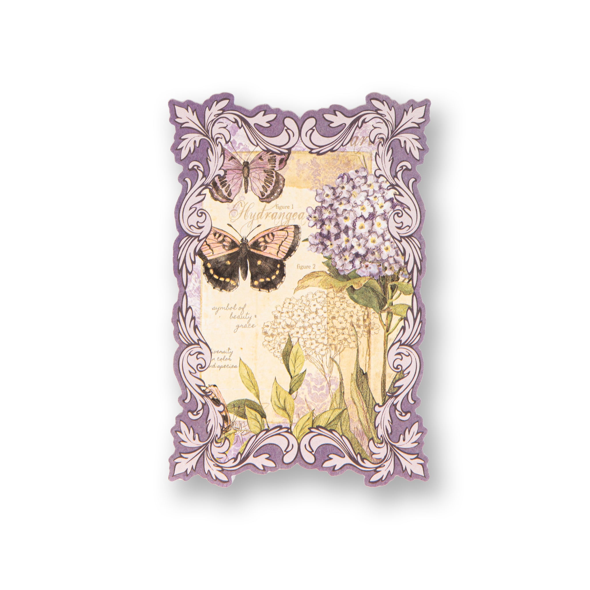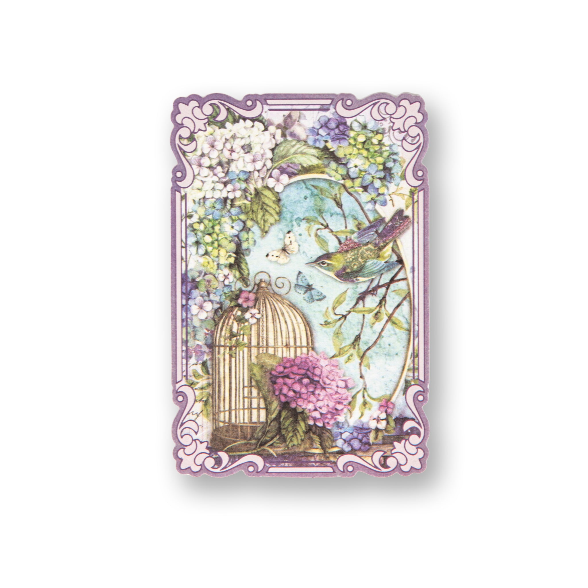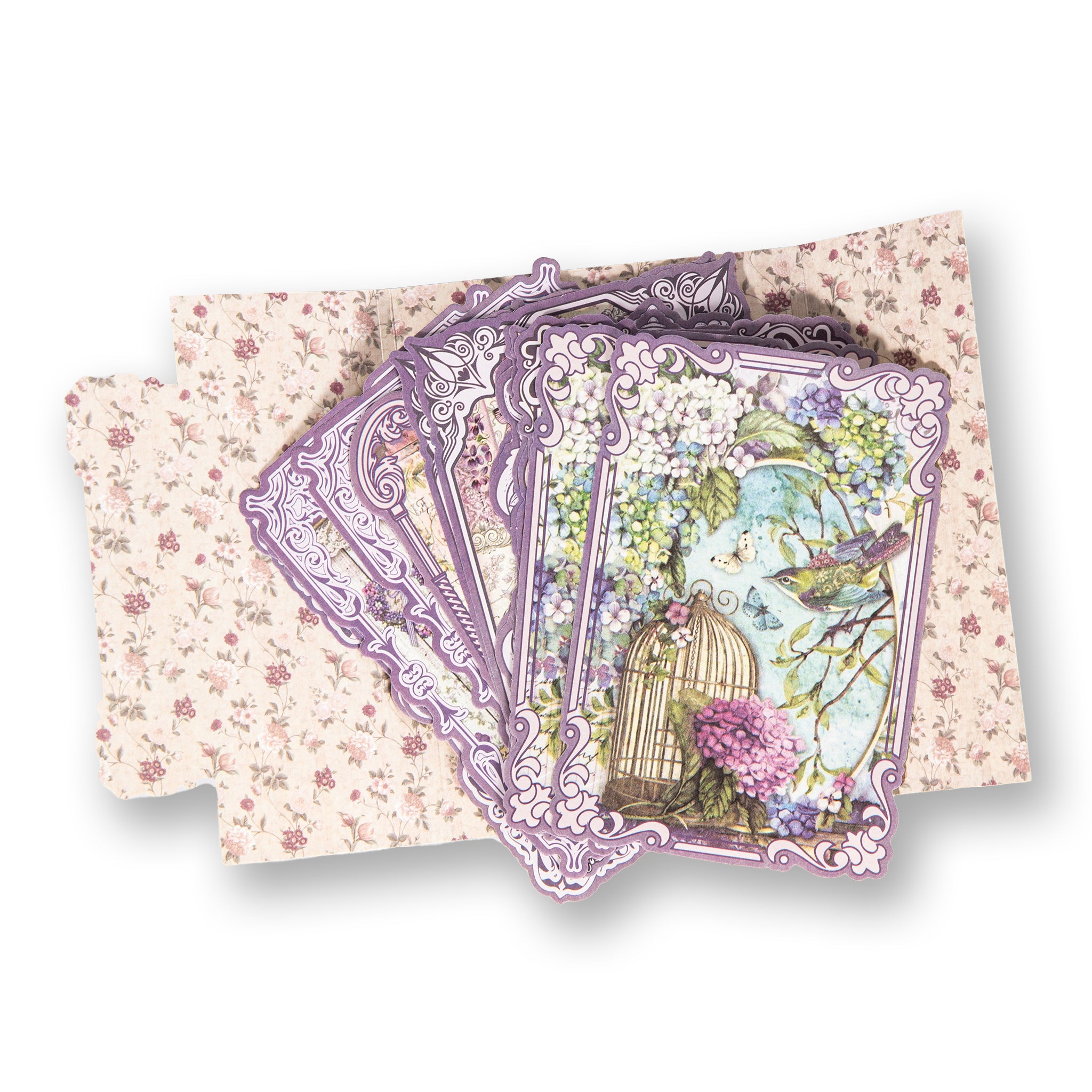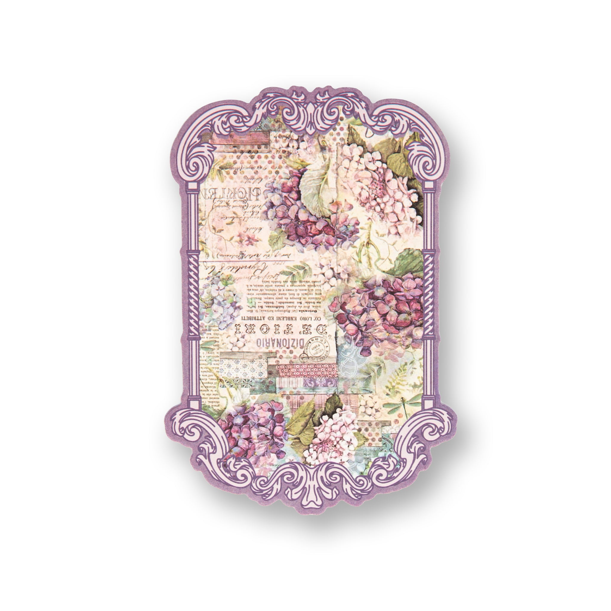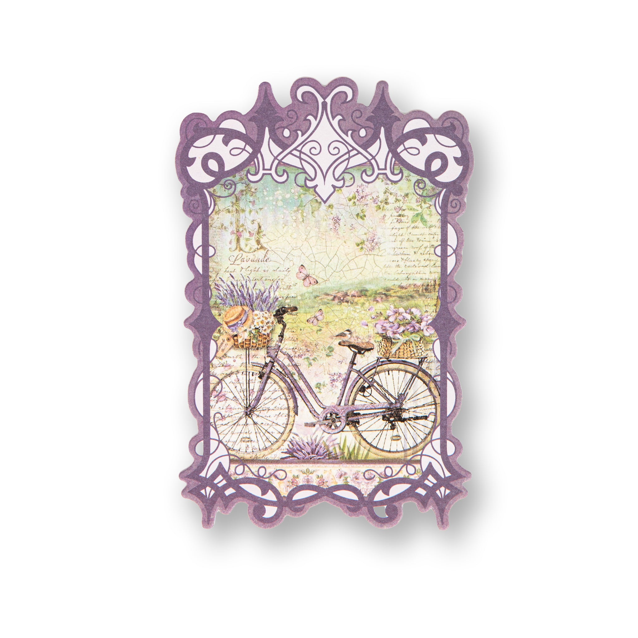 - Central Motifs: Lavender arrangements, a window with shutters, hydrangeas, and French text