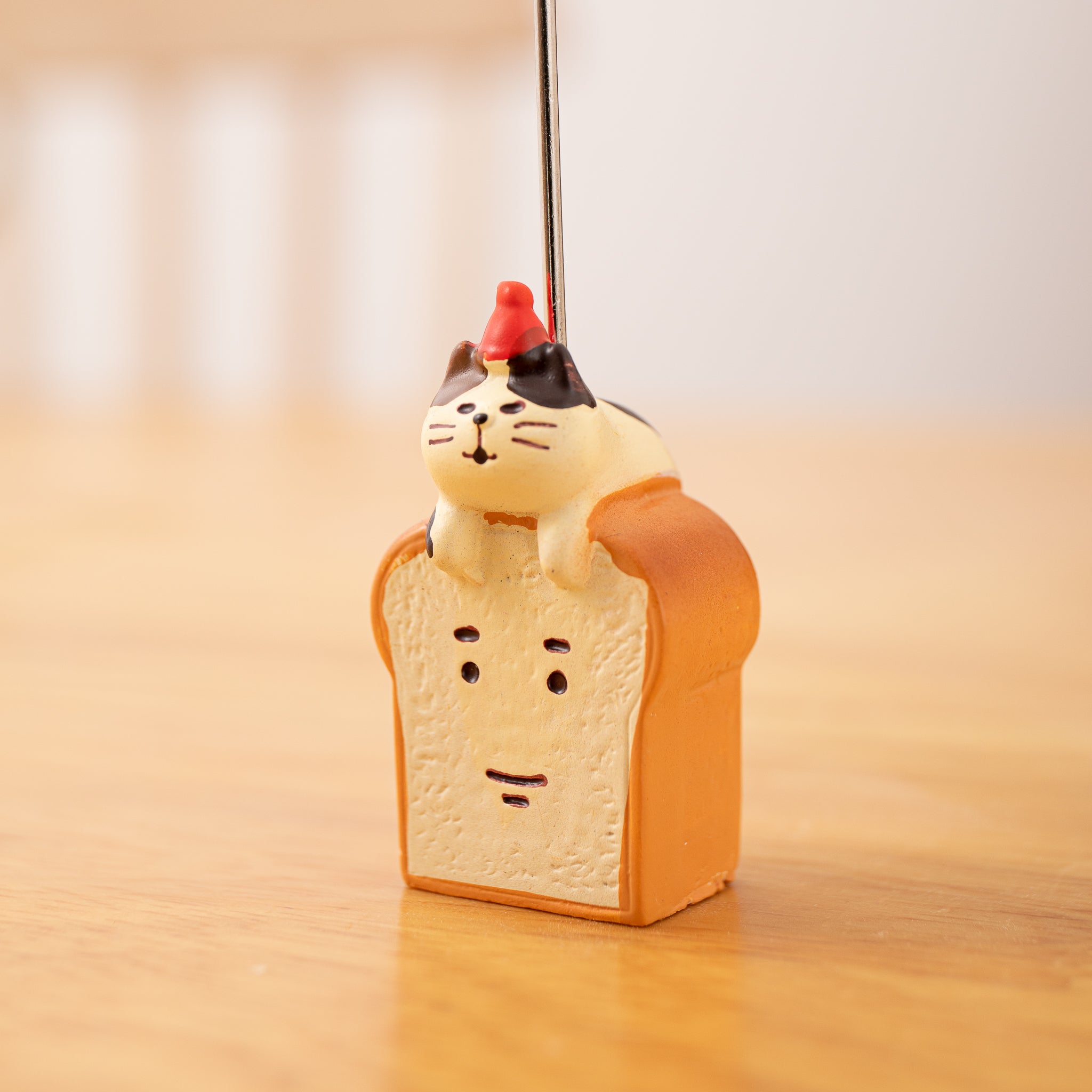 - Design: Toast – shaped base with a calico cat on top wearing a red party hat