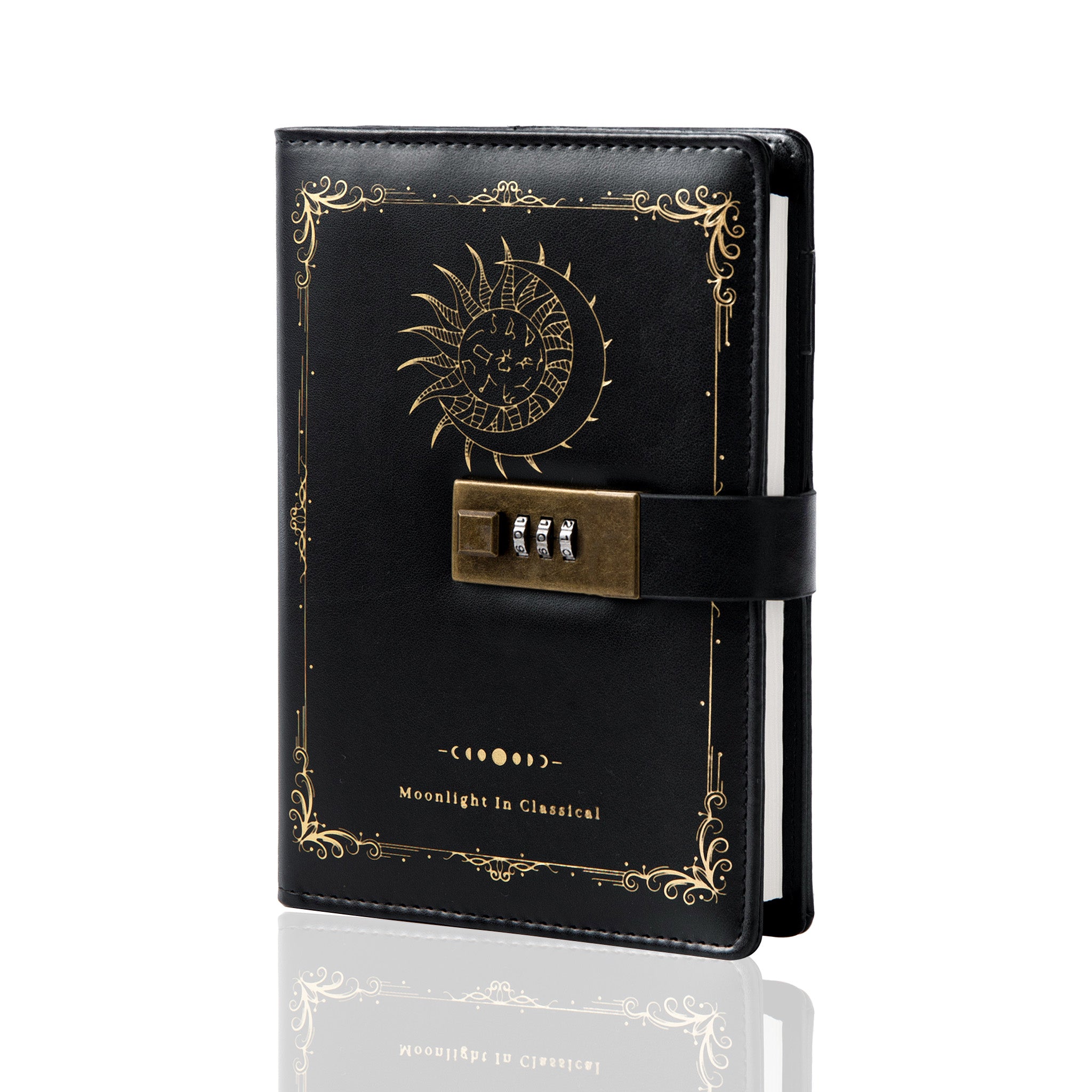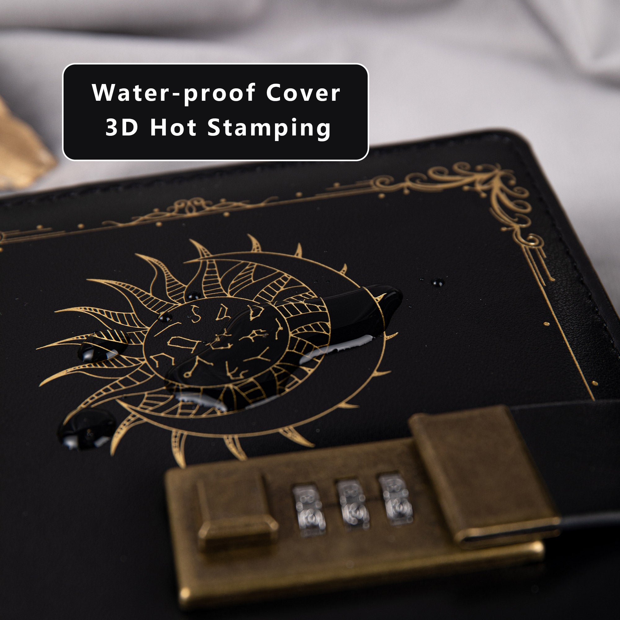- Design: Features a unique zodiac, moon, and sun design on the waterproof leather cover with gold embossed elements and decorative filigree borders